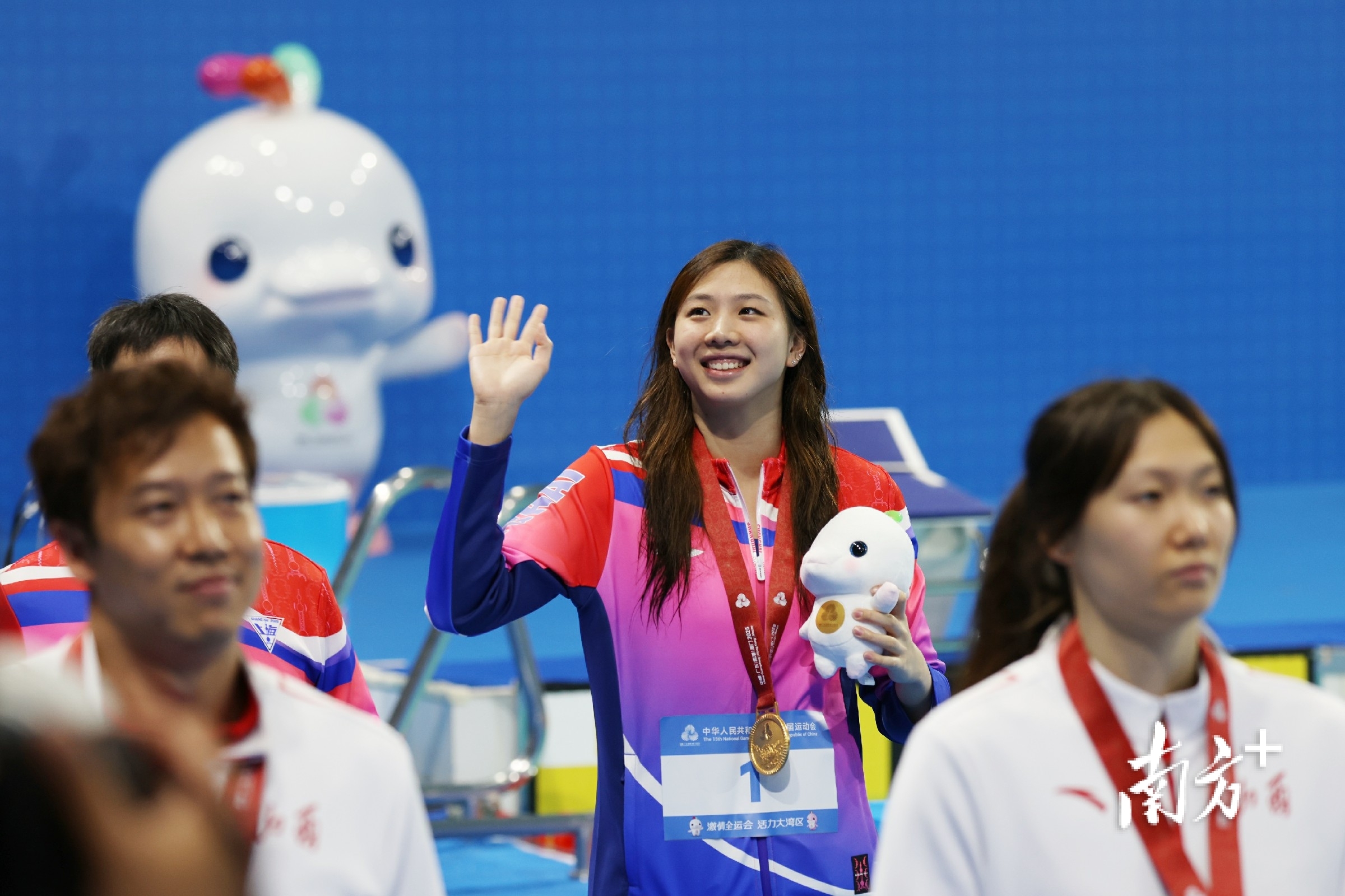 11月17日,十五运会女子50米蛙泳颁奖仪式结束后,夺得金牌的上海名将唐钱婷向观众致意。朱洪波 摄