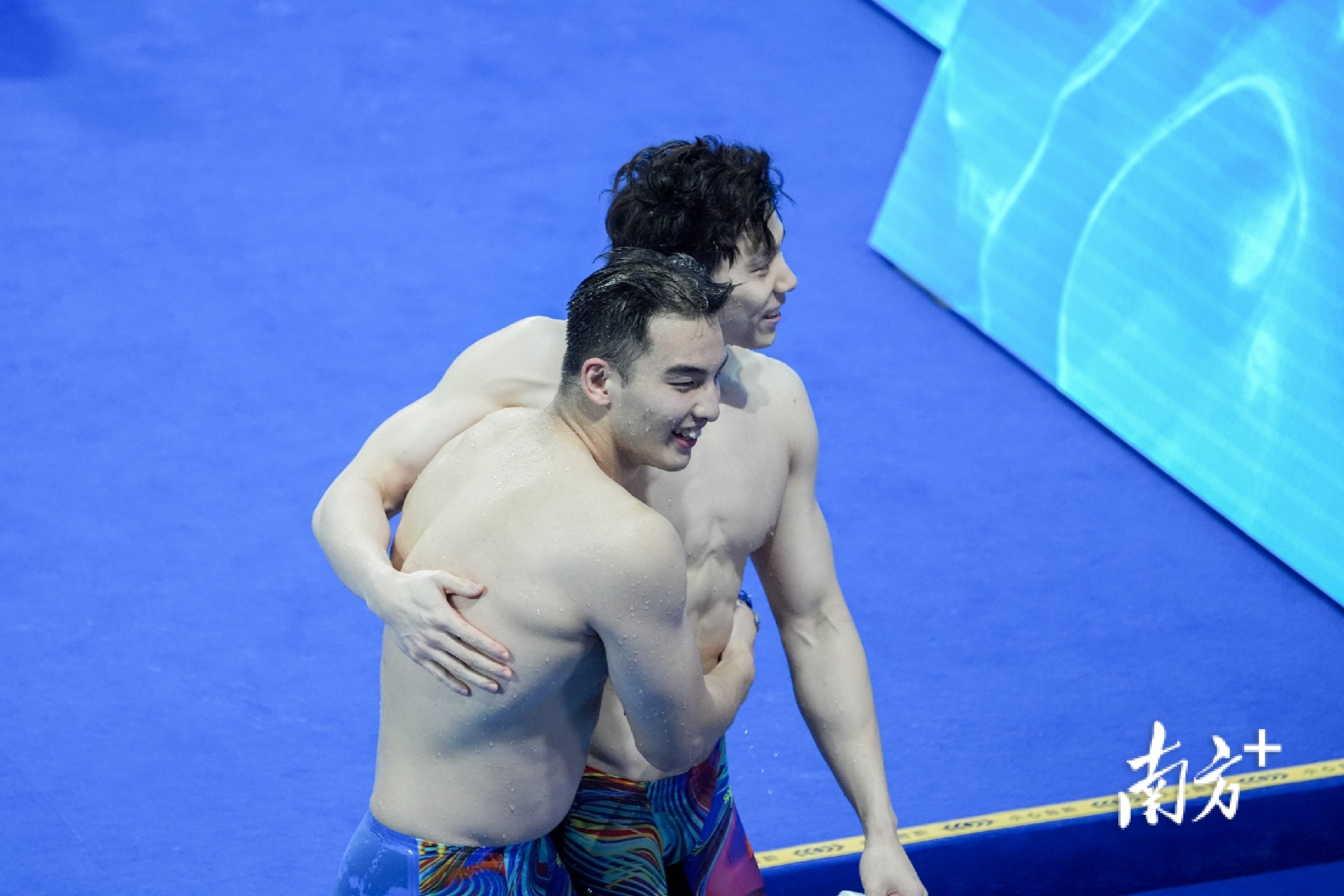 11月13日晚,在第十五届全国运动会男子50米蛙泳决赛中,上海队覃海洋(右)因抢跑犯规被取消成绩,同队队友郑英昊摘得金牌,赛后两人相拥。张令 摄