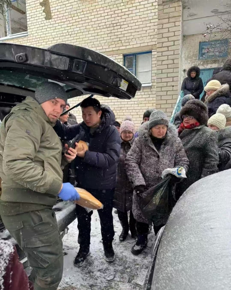 柯义(左二)为乌克兰民众提供救助。受访者供图