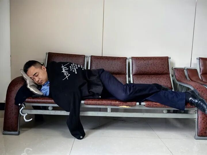 (银小强工作期间在长椅上短暂休息)