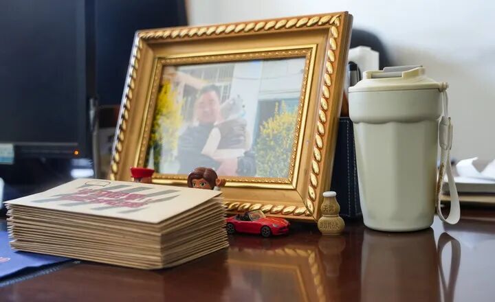 (银小强办公桌上的信件和与儿子的合影)