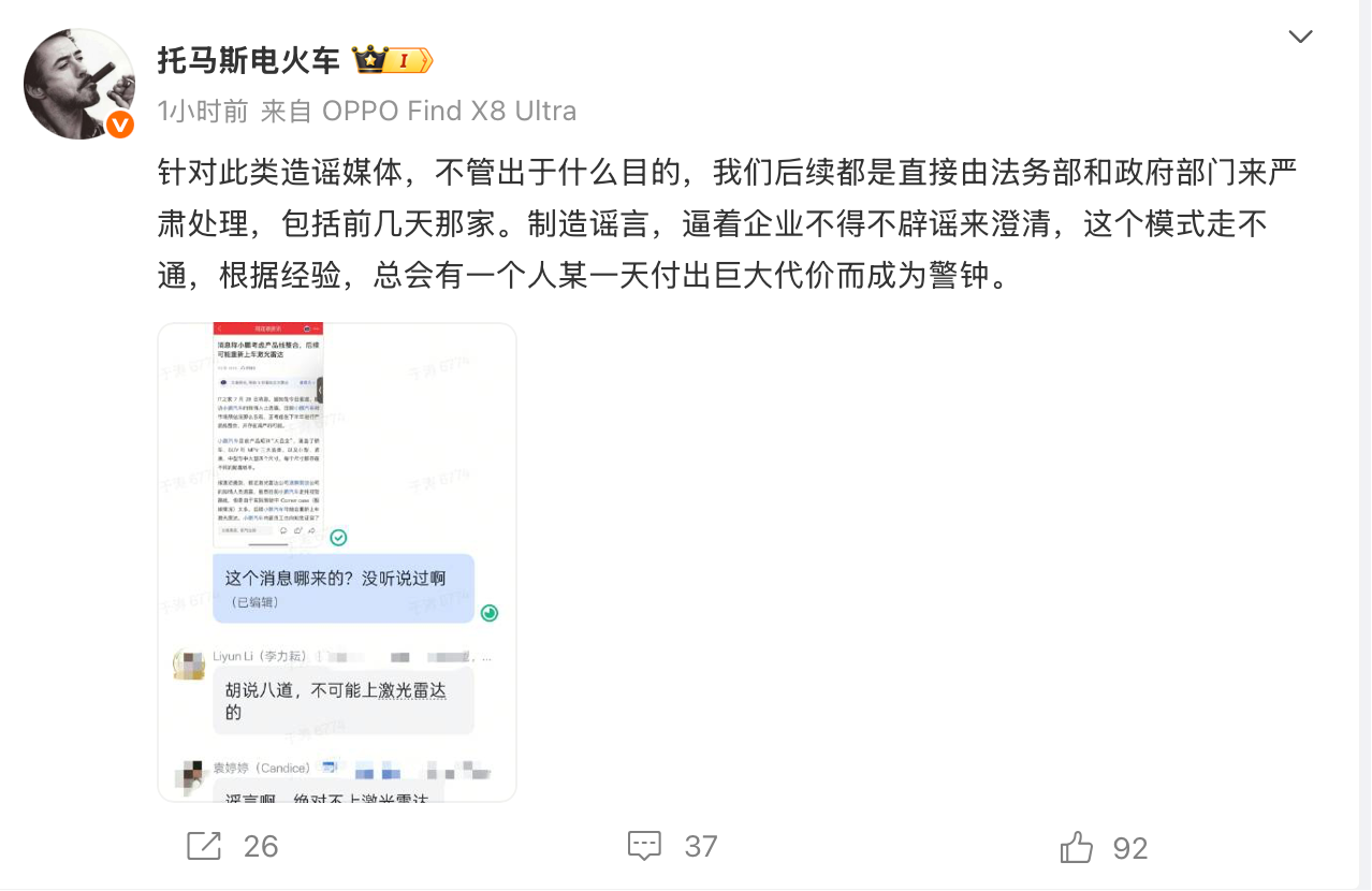7月28日,有行业媒体爆料称,小鹏汽车下半年存在减产可能且会重新考虑采用激光雷达方案。当日下午小鹏汽车副总裁通过新浪微博账号@托马斯电火车对此辟谣。三天前,其刚刚对小鹏G6将要降本的消息辟谣。