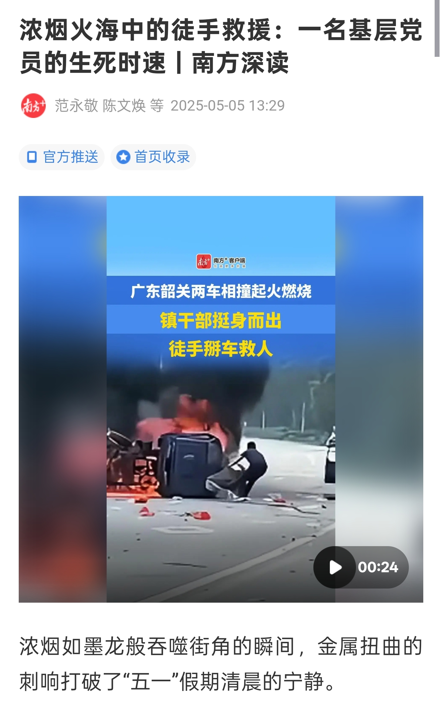 他是钟威,是韶关始兴县乡镇干部,也是一名共产党员。“这么大火,莫大的勇气!”“平民英雄!”“这一刻,您身上闪烁着光芒”“奋不顾身,发自心底的善良”……当这段浓烟火海中的徒手救援视频被发布到网上后,钟威见义勇为的事迹获得全国千万网友赞扬。