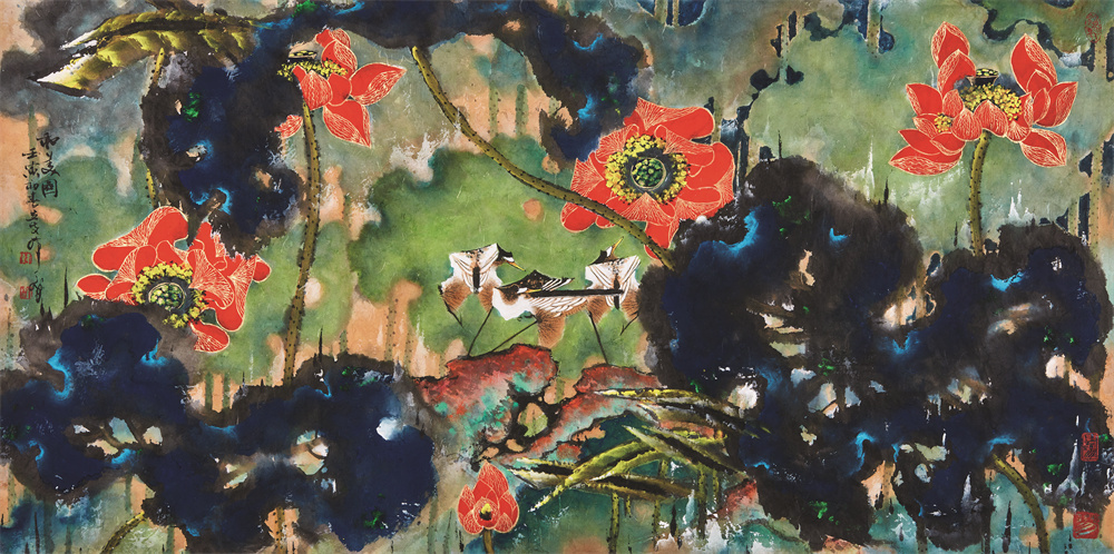 在绘画上,他以“艺通三绝,气壮千军”(徐建融语)的特质独树一帜。与多数篆刻家、书法家仅“以书入画”的简笔创作不同,韩天衡的绘画题材覆盖水墨和重彩。在构图上参考篆刻布字的疏密有致,在线条上使用书法笔墨的圆润健挺,在绘画意趣上传承唐宋古典意趣,在色彩上兼容西洋色调的浓烈饱满。