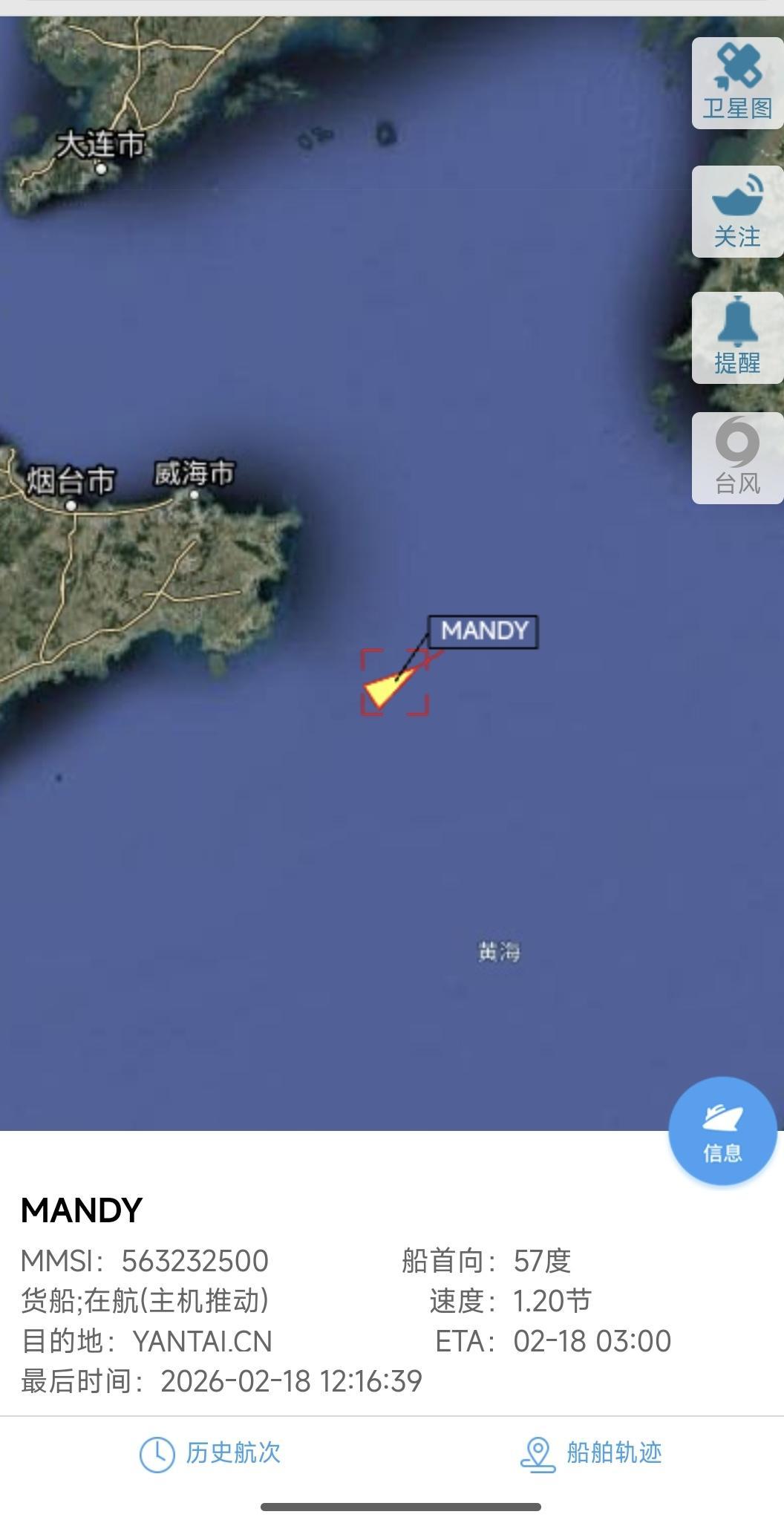涉事货船为“MANDY”轮。据山东海事局发布的消息,从山东省海上搜救中心获悉,2026年2月17日19时40分许,威海市海上搜救中心接报:新加坡籍散货船“MANDY”轮在概位36°45′N,123°05′E处机舱失火,造成2名外籍船员失联、1名外籍船员受伤。经山东省、威海市海上搜救中心组织专业救助船舶、专业救助直升机和周边商船等力量全力救助,火已熄灭,受伤船员被及时送医救治,2 名失联船员在机舱内找到,已无生命体征。