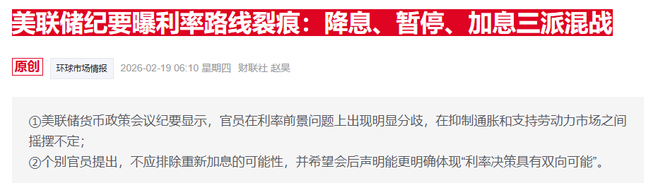 盘中,美联储公布的1月货币政策会议纪要显示,有个别官员提出,不应排除重新加息的可能性,并希望会后声明能更明确体现“利率决策具有双向可能”。