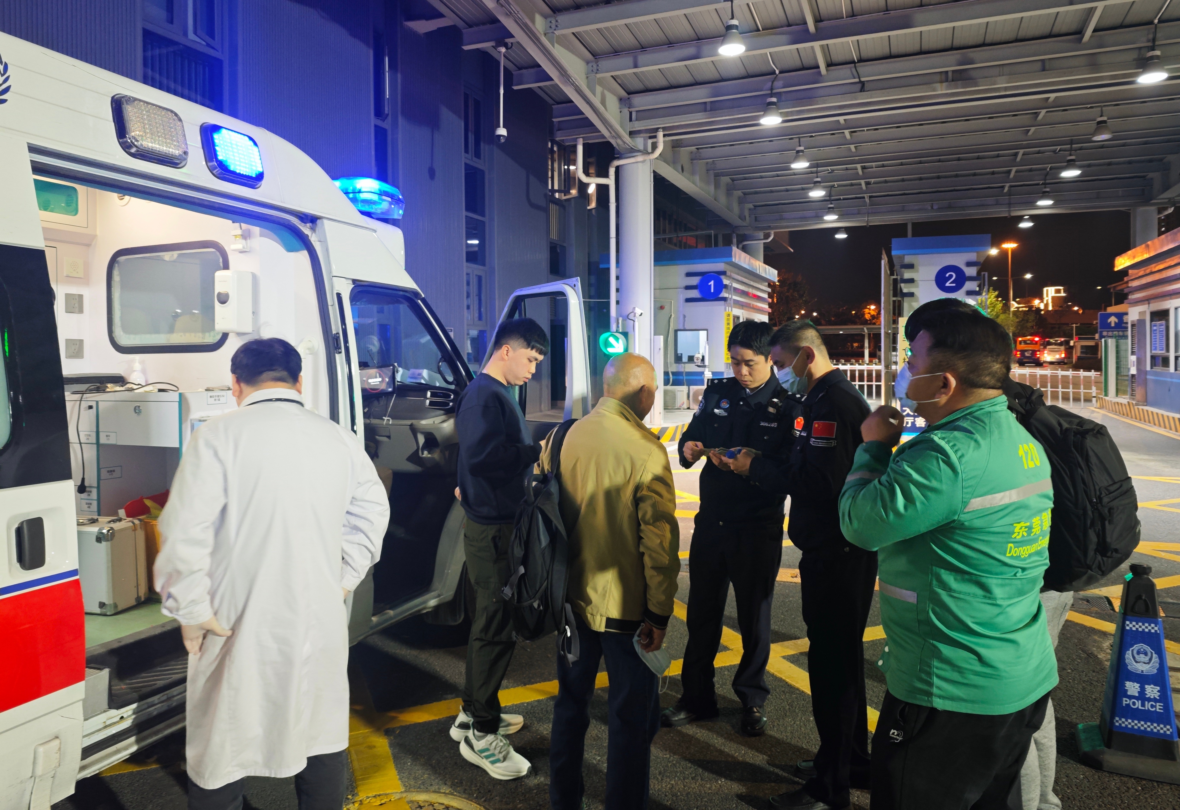 2月18日(大年初二)凌晨2时许,一阵急促的120急救车鸣笛划破了皇岗口岸深夜的宁静。车上载着一位61岁突发脑梗的女性香港同胞,病情危重,亟须返港进行抢救。时间就是生命,陪同的医护人员与家属焦急地向皇岗边检站执勤九队民警求助。