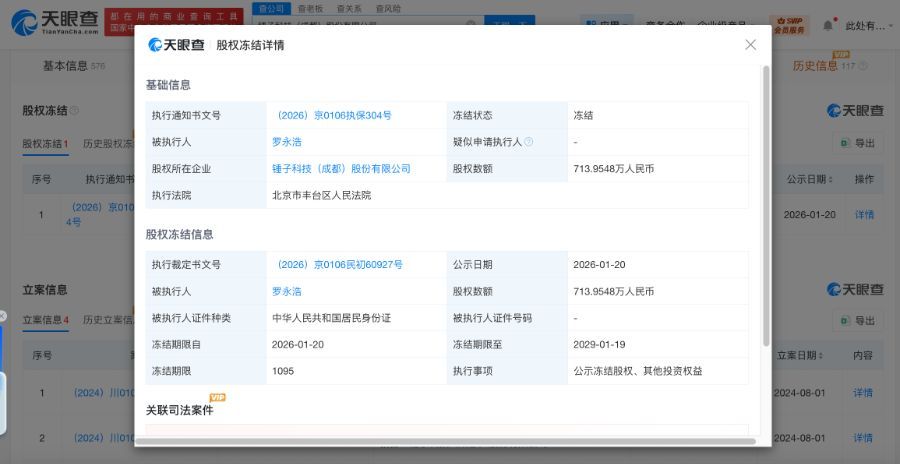 天眼查天眼风险信息显示,近日,罗永浩新增一则股权冻结信息,股权所在企业为锤子科技(成都)股份有限公司,冻结股权数额713万余元,冻结期限自2026年1月20日至2029年1月19日,执行法院为北京市丰台区人民法院。详情>>