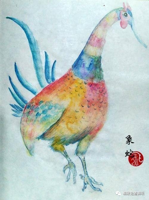 这是现代人根据《山海经》的原文画出的象蛇,看起来很像雉鸡。因为它的名字里有大象的象字,所以就画了这个雉鸡长了很长的鼻子,但是这个理解是错误的。