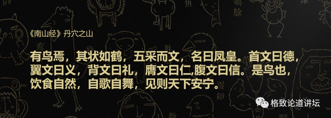 在《南山经》里有个丹穴山,丹穴山上有一只鸟,形态像仙鹤,身上也是五采而文。它的身上有有五种颜色的花纹,头上的花纹叫德,翅膀上的花纹叫义,即道义、正义,后背上的花纹叫礼,即礼节、礼仪,胸部上的花纹叫膺纹,表示仁爱,腹部的花纹叫信,表示诚信。