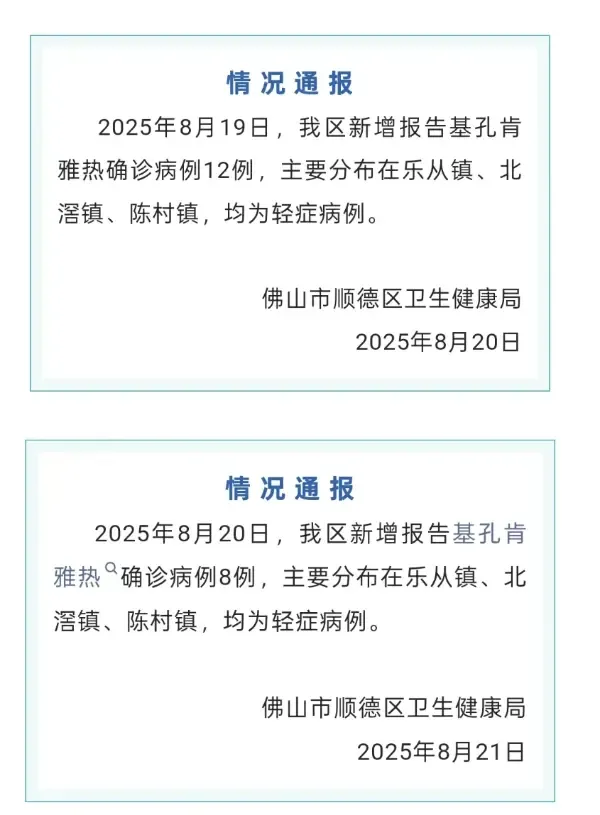 据佛山市顺德区卫生健康局发布的情况通报,8月19日、20日顺德区新增报告基孔肯雅热确诊病例均为轻症病例。