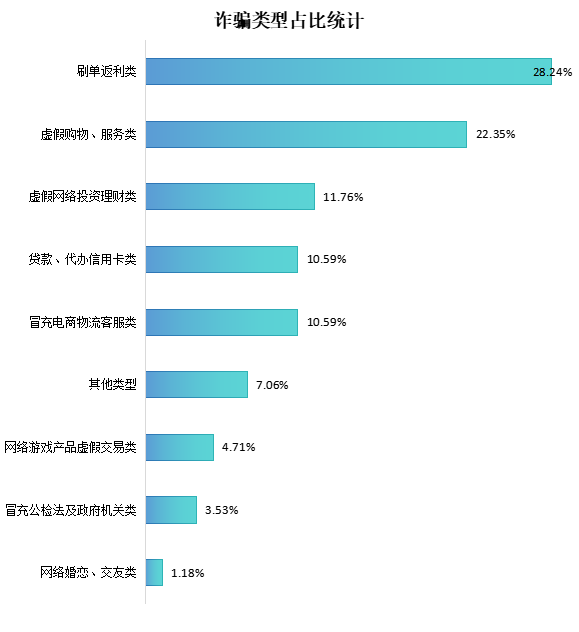 本周,江门市高发诈骗类型为刷单返利类,虚假购物、服务类,虚假网络投资理财类,贷款、代办信用卡类,冒充电商物流客服类。