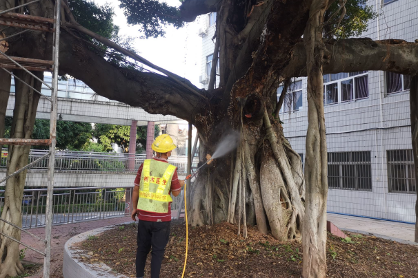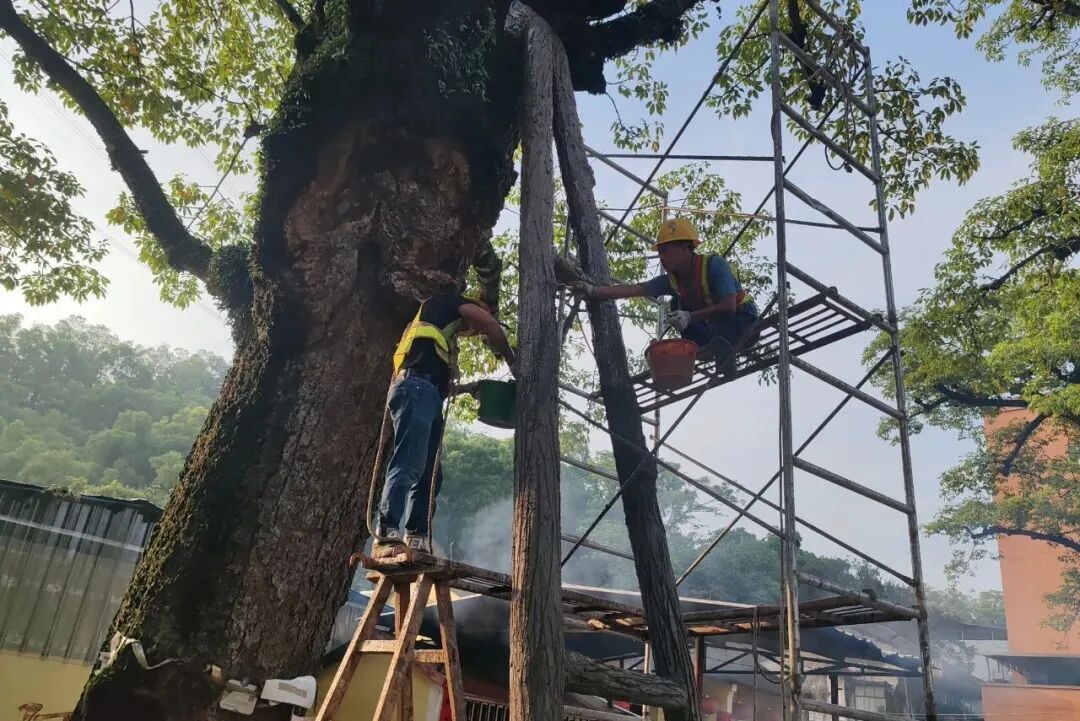 综合运用虫情监测、生物防治、低毒药剂施用等绿色防控手段,有效控制白蚁、蛀干害虫和叶部病害蔓延。在保护古树健康的同时,最大限度减少对周边环境的影响,帮助古树恢复自我防御能力。