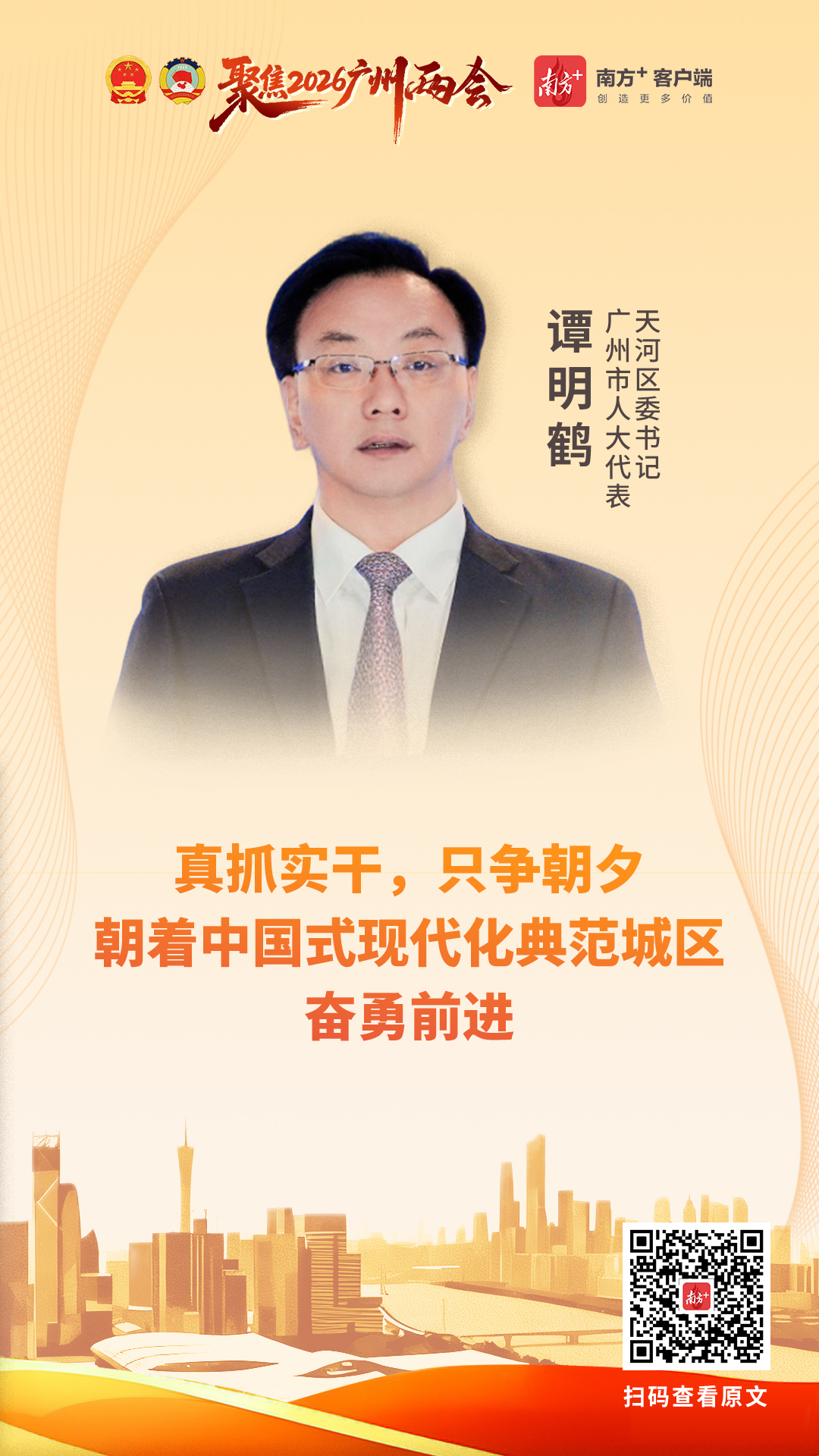 置身于全市发展大局中,如何将蓝图变成高质量发展的生动实践?广州市人大代表、天河区委书记谭明鹤表示,今年市两会是一次高举旗帜、凝心聚力、催人奋进的大会,天河区将深入学习贯彻习近平总书记对广东、广州系列重要讲话和重要指示精神,认真贯彻省委十三届八次全会、市委十二届十一次全会部署要求,细化落实市两会精神的任务书、时间表、路线图,坚持开局就要冲刺、全年都要加力,奋力跑出加速度、干出新业绩,为广州跑好“十五五”关键时期第一程作出更大贡献。