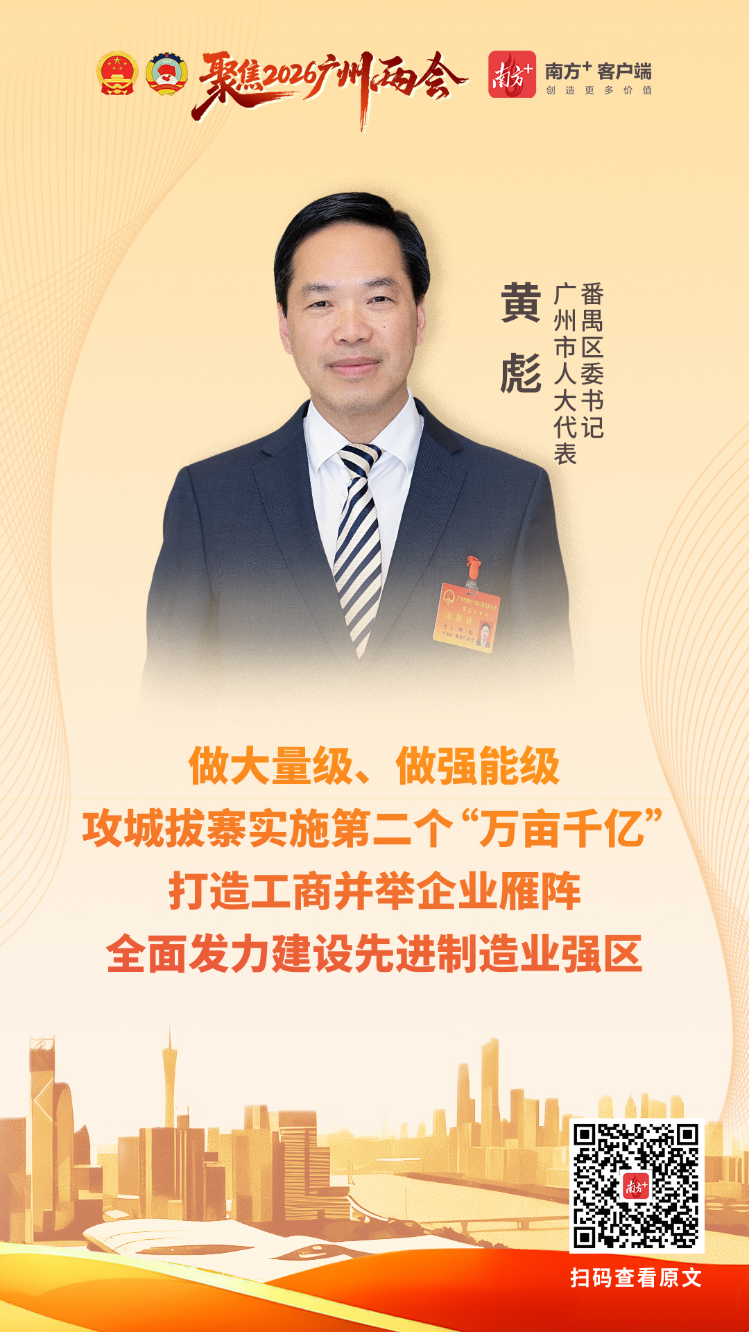广州市人大代表、番禺区委书记黄彪表示,广州市两会吹响了2026年开局就要冲刺、全年都要加力的号角,番禺区凝心聚力将其转化为施工图、实景图,扛起经济大区“走在前、作示范、挑大梁”的使命担当,全力以赴做大量级、做强能级,打造全市、全省乃至全国的先进制造业强区,建设粤港澳大湾区的宜居宜业宜游优质生活圈,在关键时期第一程展现番禺新作为、勃发番禺新气象。
