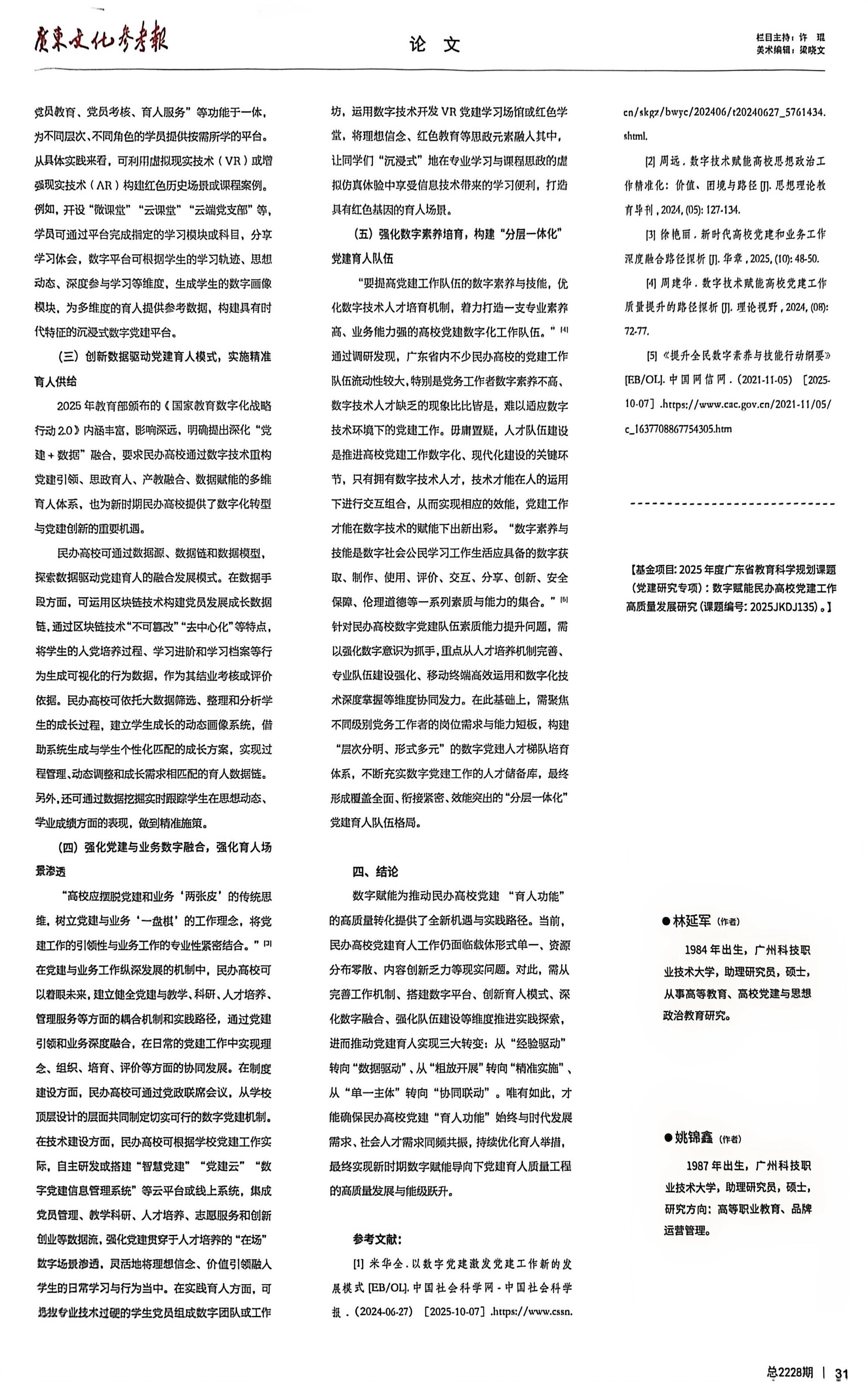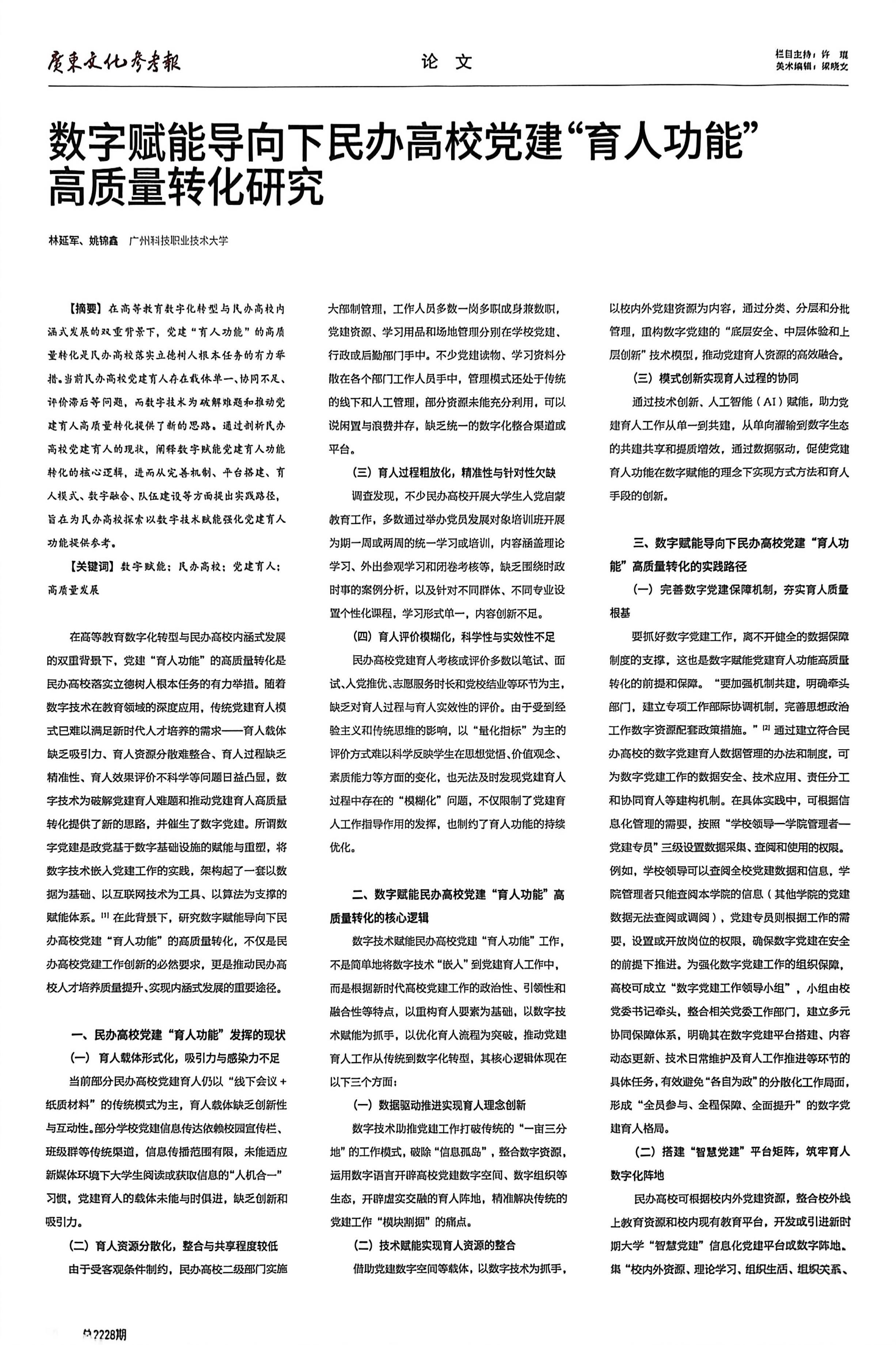 [基金项目:2025年度广东省教育科学规划课题(党建研究专项):数字赋能民办高校党建工作高质量发展研究(课题编号:2025JKDJ135)。]