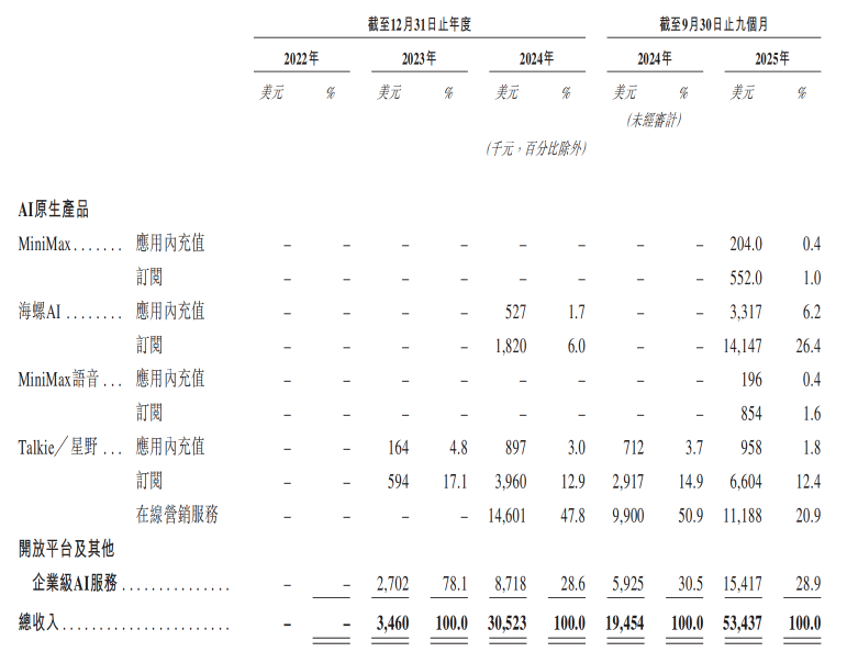 MiniMax在2022年、2023年、2024年以及截至2025年9月30日的营收分别为0、2420万元、2.14亿元和3.76亿元。