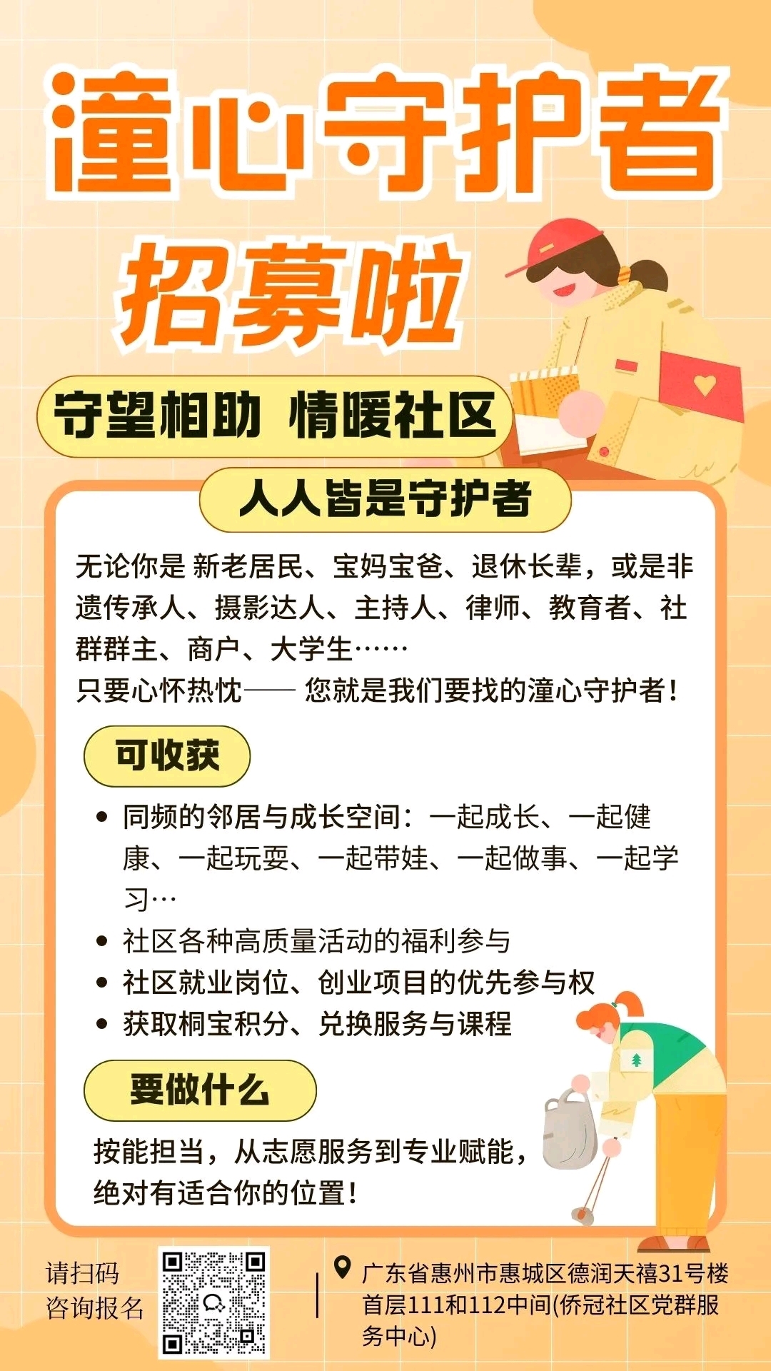 目前,侨冠社区未来社区正在招募“潼心守护者”,无论是党员、热心居民、全职家长、退休人士,还是非遗传承人、摄影爱好者、主持人等身怀绝技的达人,都可以报名参加。届时,“潼心守护者”在为未来社区提供志愿服务、进行专业赋能的同时,还可以优先解锁社区高品质活动、赚取“潼宝积分”兑换超值课程与服务等。