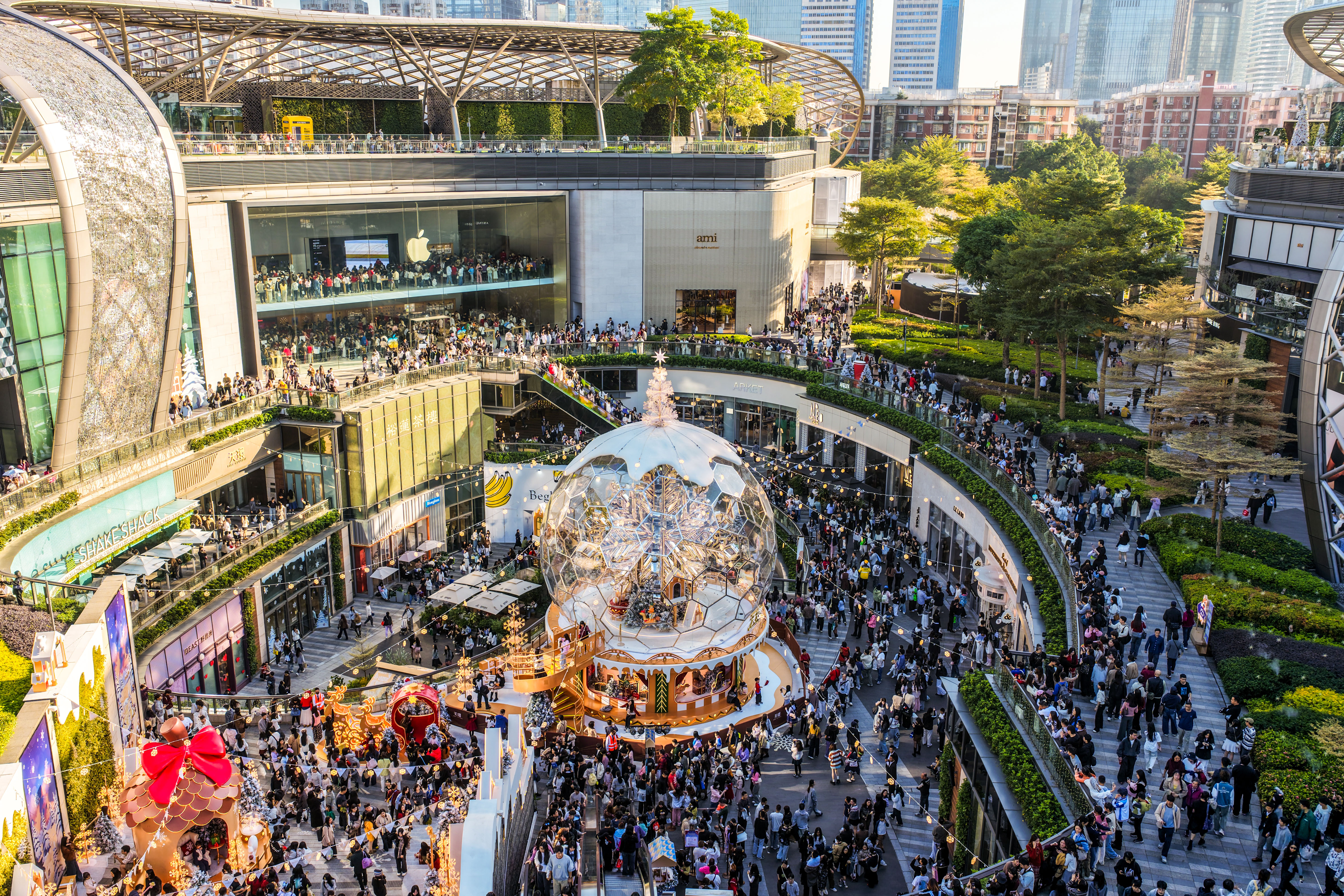 广州天環Parc Central则自11月下旬起,化身超1500㎡“雪域小镇”,标志性的“广式”大雪人携手全国首创的15米高巨型互动水晶球,为广州营造浪漫冬日奇境。自亮相以来,活动吸引了大量全国各地游客到访,商场客流同比提升30%,新增会员超2万人。