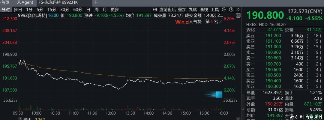 12月31日上午,泡泡玛特午市收市报187.7港元/股,跌1.62%,总市值约2521亿港元。