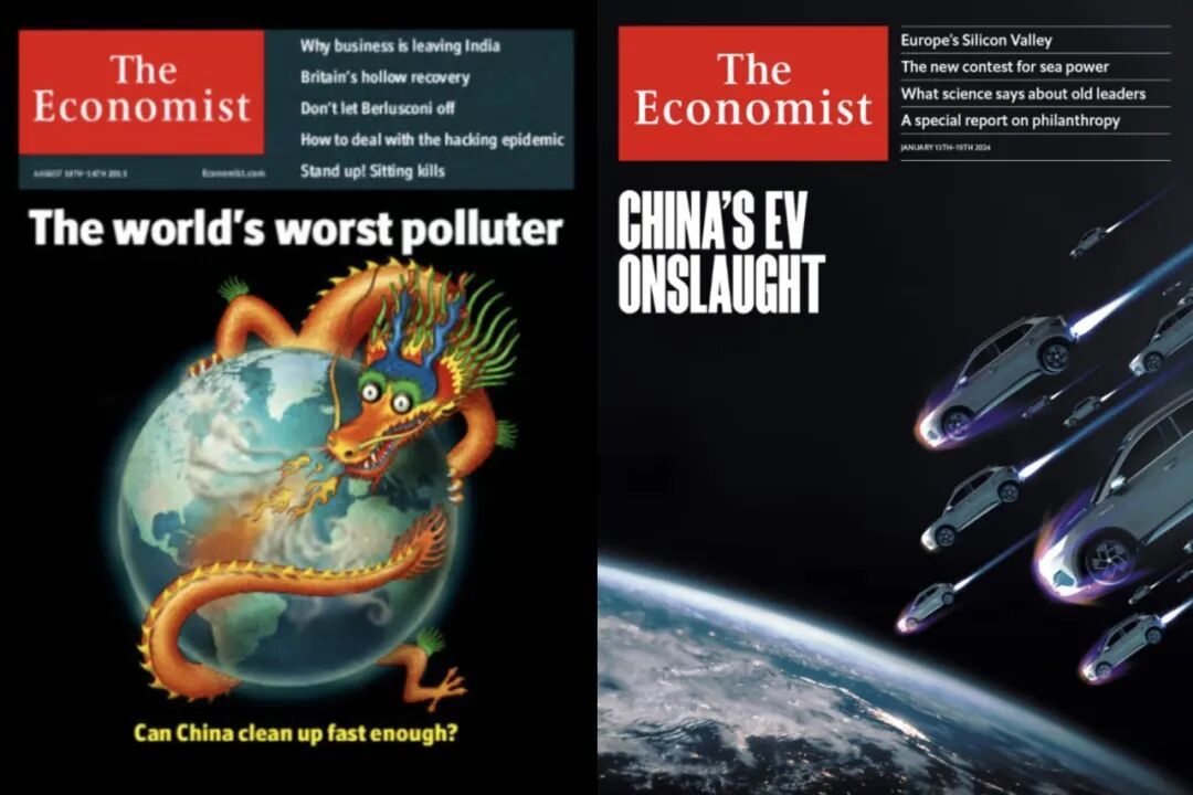 英国《经济学人》杂志2013年、2024年的两期封面。左边将中国描绘成一条用污染摧毁地球的恶龙,右边将中国新能源汽车描绘成砸向地球的陨石。