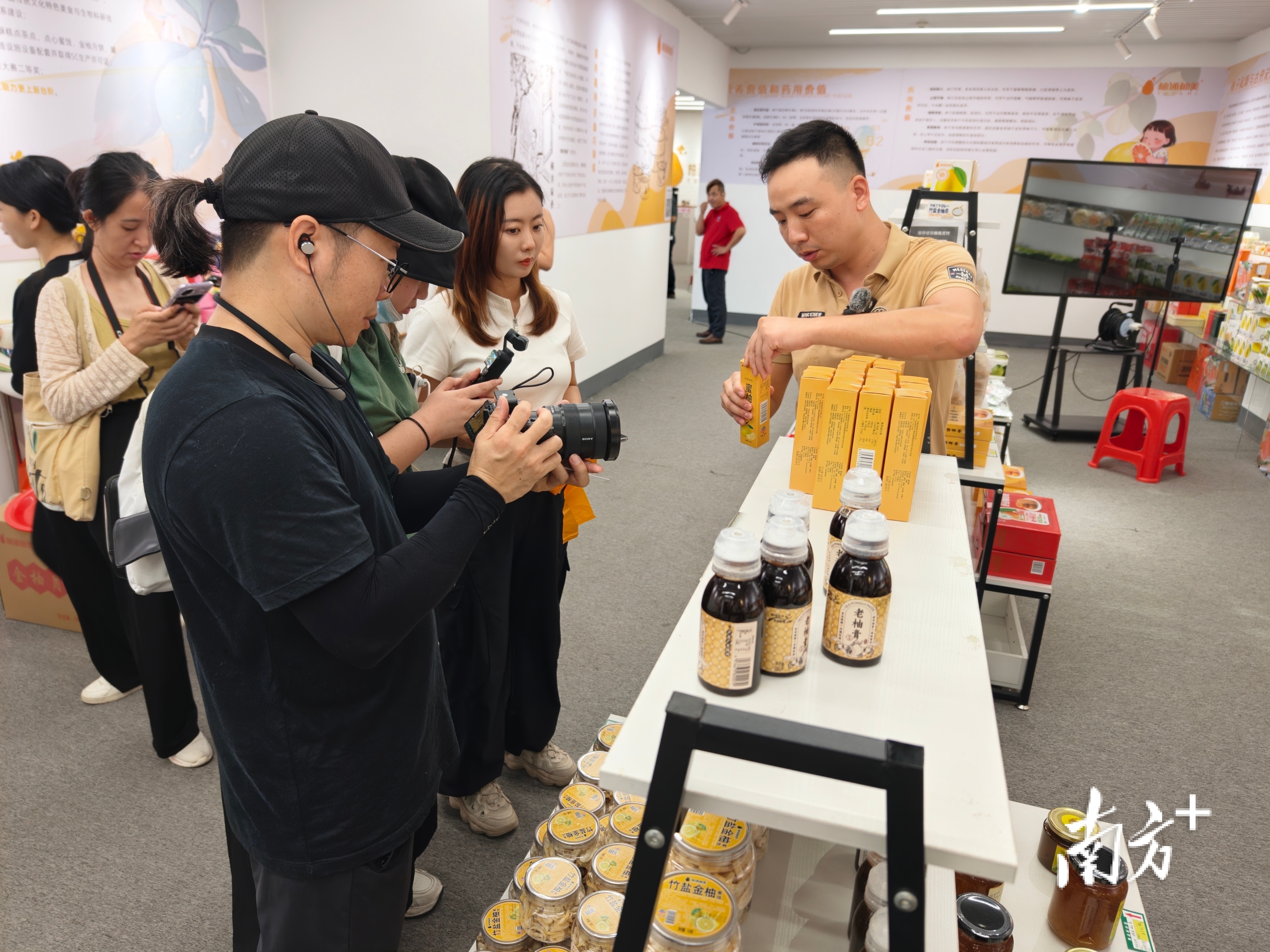 企业代表向网红介绍柚子产品。