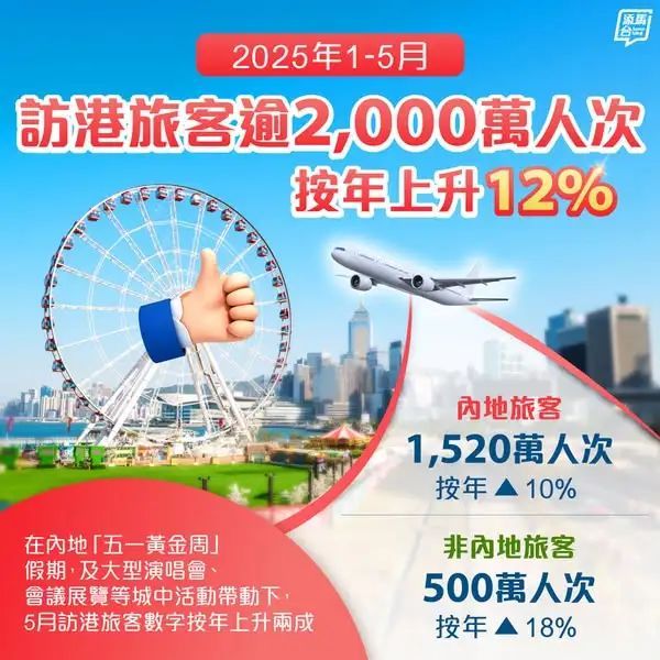 6月16日,香港旅游发展局公布的初步数据显示,香港今年首5个月访港旅客量录得逾2,000万人次,按年增加12%。