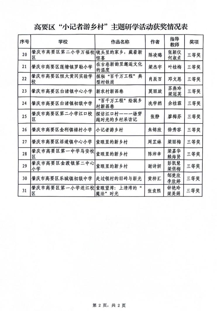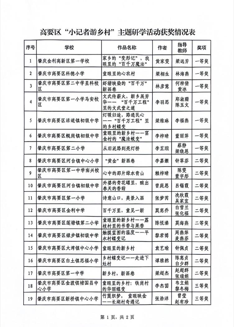 高要区“小记者游乡村”主题研学活动获奖情况表。