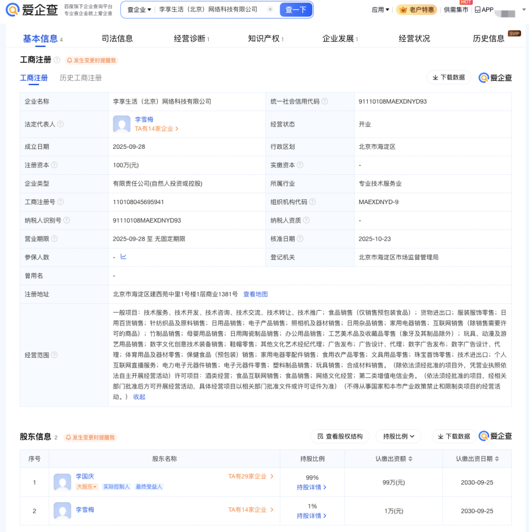 爱企查App显示,李享生活(北京)网络科技有限公司成立于2025年9月,法定代表人为李雪梅,注册资本100万元人民币,经营范围包括货物进出口、服装服饰零售、日用百货销售等,由李国庆、李雪梅分别持股99%、1%。