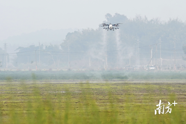 在高明万亩稻田,农业无人机在田间作业。戴嘉信 摄