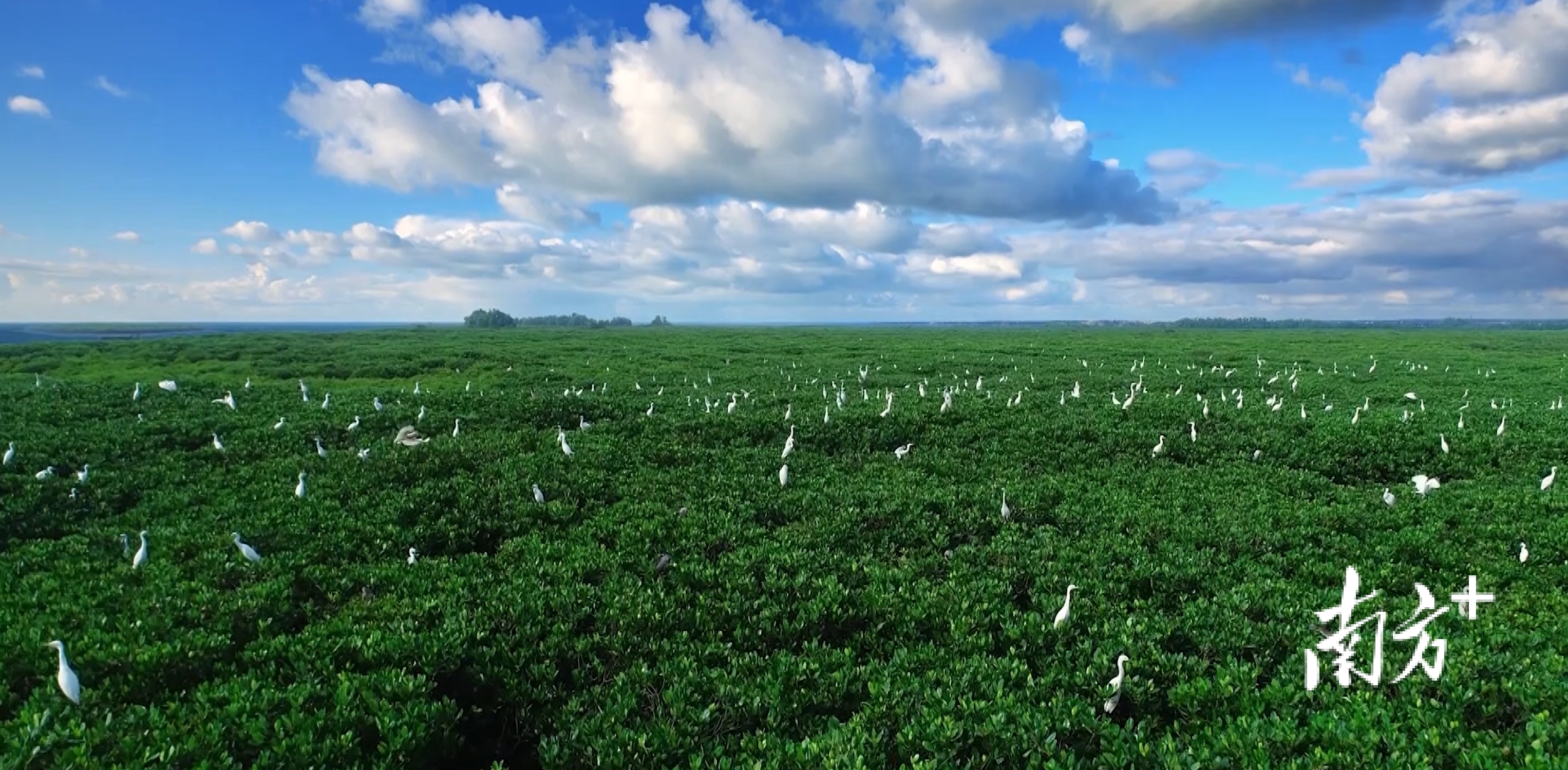 在红光村,与蚝产业休戚与共的,是那片天然红树林。站在红林鹭影观景平台上极目远眺,绿色的林带与蓝色的海湾交织,白鹭翩飞,景色宜人。