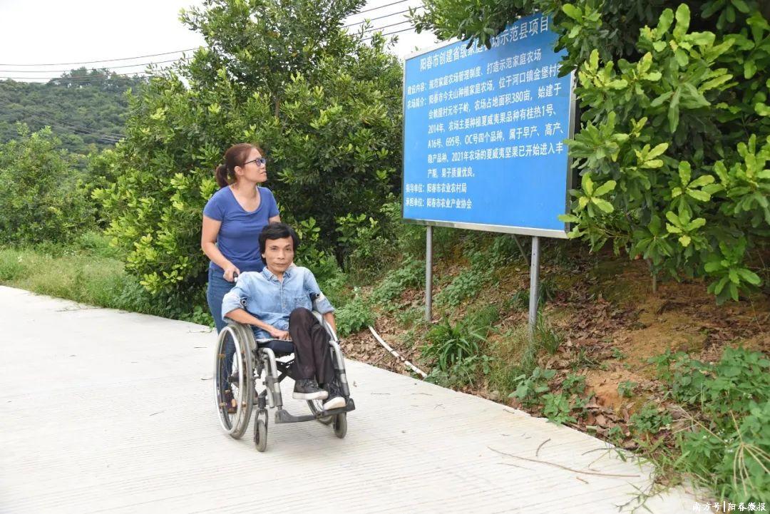 黎创,小时因病致残,2014年返乡创业。经过深入调查了解,结合气候条件、土壤质量、市场发展和本人实际情况,他决定在河口镇金堡村委会赖屋自然村租地成立“断点农业有限公司”, 创立阳春坚果(又称夏威夷果或澳洲坚果)种植实验基地。凭着坚强的意志,他用了近10年间坐着轮椅种下了一座“花果山”。