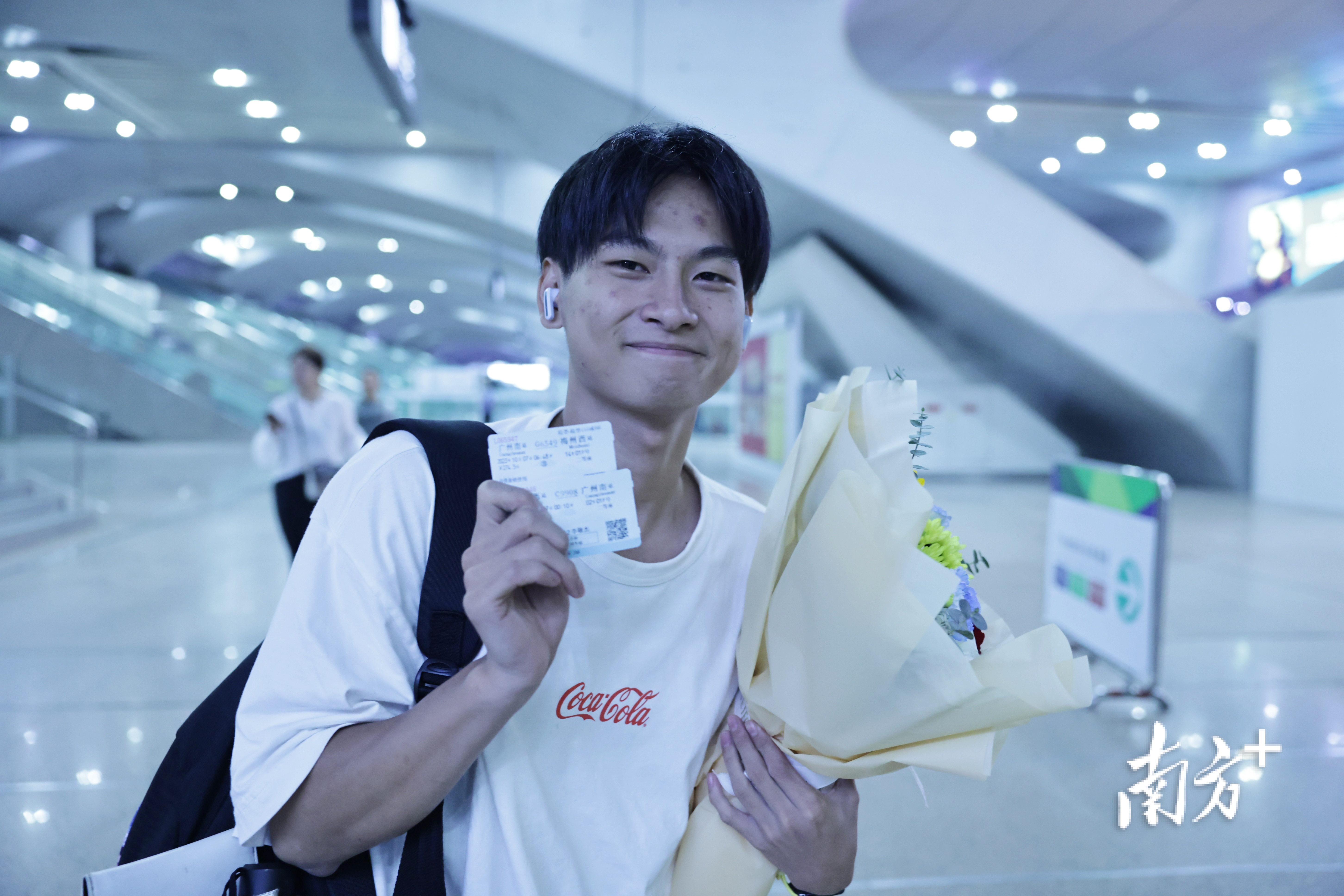 “00后”李敬杰目的地是800公里外的梅州,那里有他的意中人。他手捧着鲜花、洋溢着幸福,“到了花还是新鲜的”。
