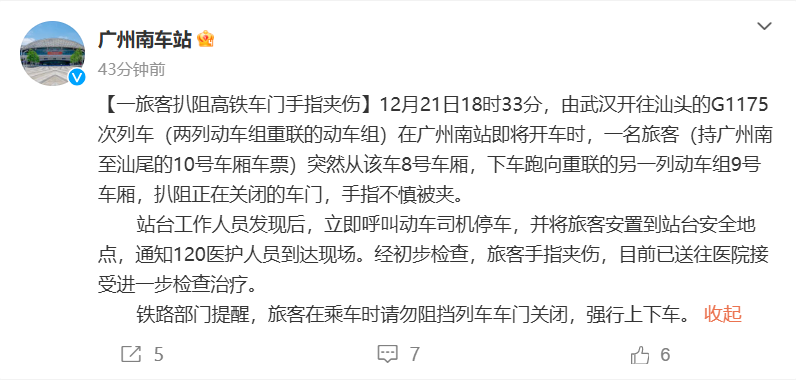 针对此事,@广州南车站 通报称,12月21日18时33分,由武汉开往汕头的G1175次列车(两列动车组重联的动车组)在广州南站即将开车时,一名旅客(持广州南至汕尾的10号车厢车票)突然从该车8号车厢,下车跑向重联的另一列动车组9号车厢,扒阻正在关闭的车门,手指不慎被夹。
