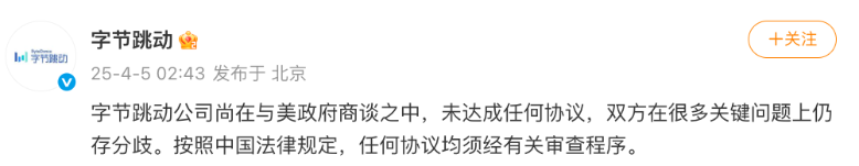 4月5日凌晨,@字节跳动发布声明称,字节跳动公司尚在与美政府商谈之中,未达成任何协议,双方在很多关键问题上仍存分歧。按照中国法律规定,任何协议均须经有关审查程序。