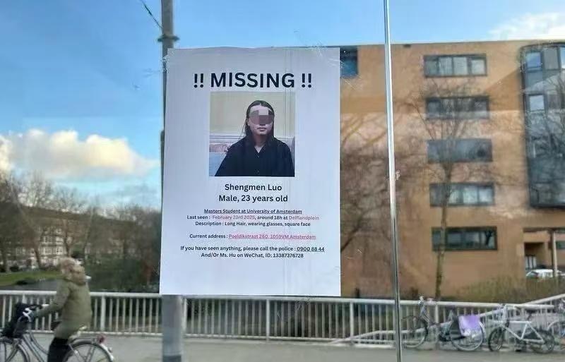 寻人启事。公开报道显示,当地时间3月21日下午,荷兰警方在Nieuwe Meer水域展开搜索时发现一具遗体。此次搜索是因来自中国的阿姆斯特丹逻辑语言计算研究院的学生罗生门失踪而启动。经警方调查确认,遗体身份为罗生门。警方表示,死因仍在调查中,目前尚未排除任何可能性。