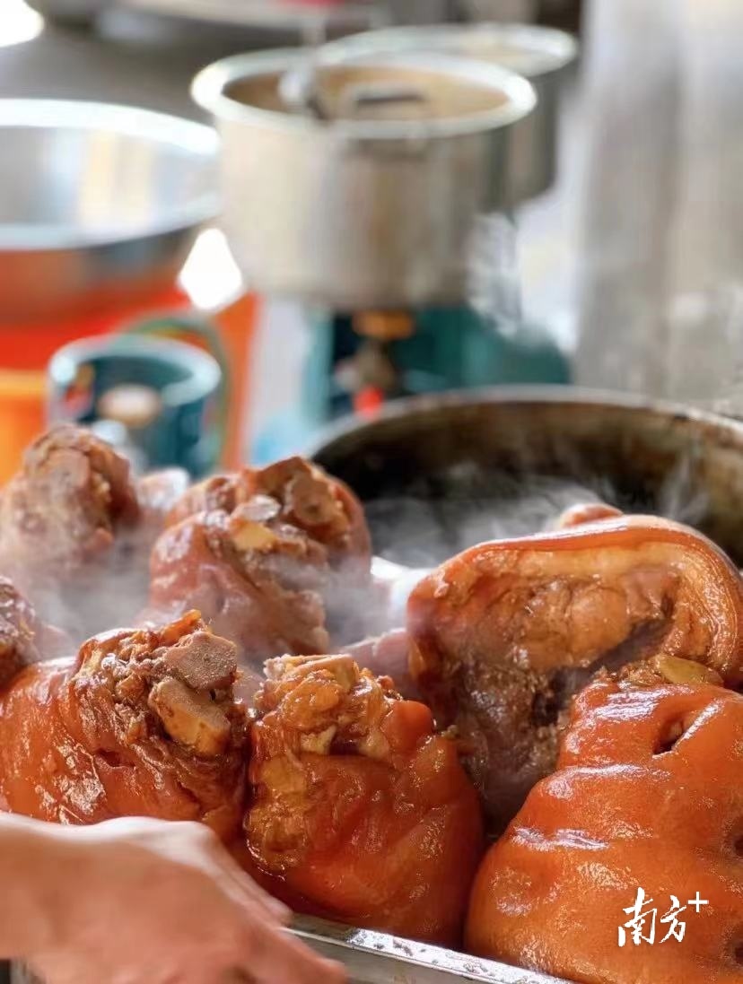 在隆江镇,“猪脚兴”小有名气,不少消费者在大众点评上自发带货,留下“正宗”“猪蹄软糯”“卤香十足”的评价,吸引更多游客前往打卡。