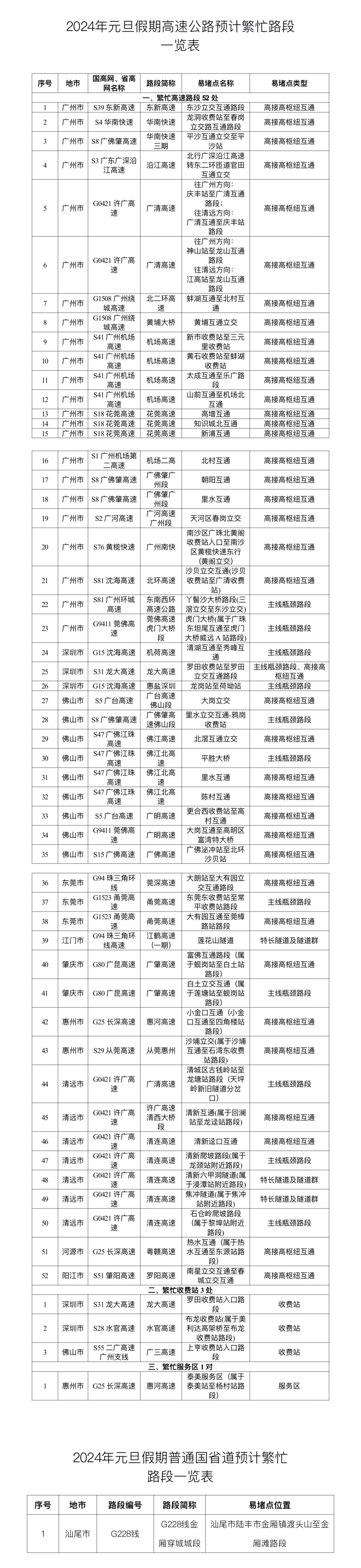 2024元旦假期,预计全省高速公路易堵点位共计56处,其中易堵路段52处,易堵收费站3处,易堵服务区1对;全省普通国省道易堵点位1处。