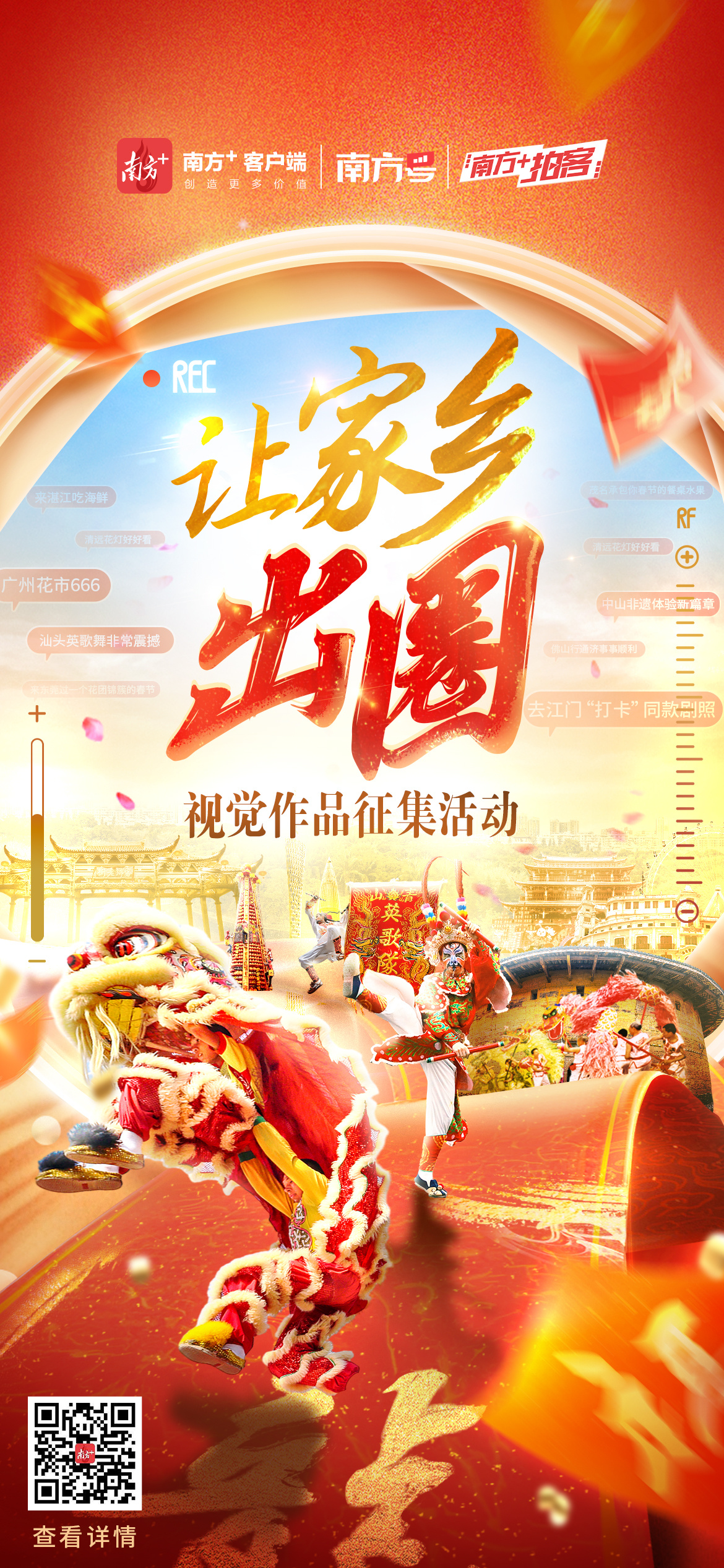 以“让家乡出圈”为主题进行随手拍,展现广东各地新年盛景、风土人情、民俗年味、特色美食、标志性场所、文体活动等,力求挖掘有趣、有用或能引起共鸣的瞬间,打造充满人情味的视觉作品。