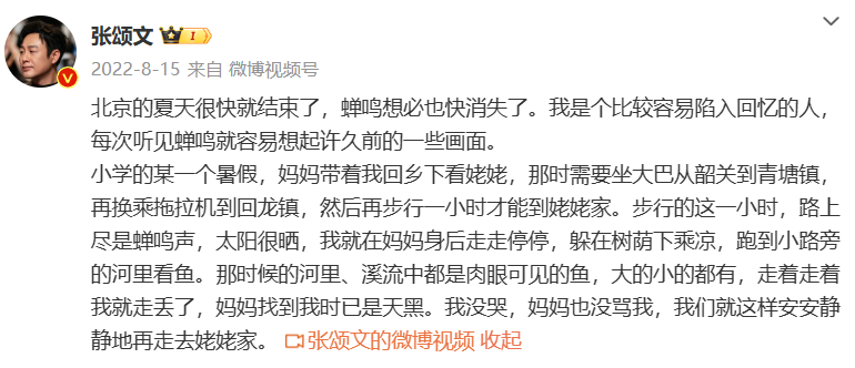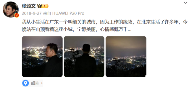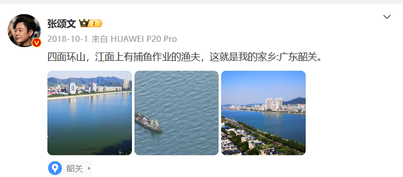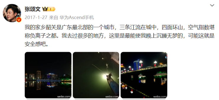 “我去过很多地方,这里是最能使我晚上沉睡无梦的。”张颂文在微博中写道,“我的家乡韶关是广东最北部的一个城市,三条江流在城中,四面环山,空气指数堪称负离子之都。”