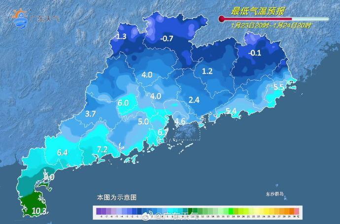 @广东天气预计,23日-24日,受冷空气补充影响,广东省大部阴雨寒冷天气,有大范围的5℃及以下低温,粤北、珠三角北部的山区最低气温可达0℃以下有冰冻,粤北山区有冻雨或小雪。