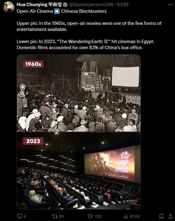 2023年,电影《流浪地球2》在埃及首映。同年,国产电影占全国电影票房超过83%,越来越多的优秀国产影片走出国门。