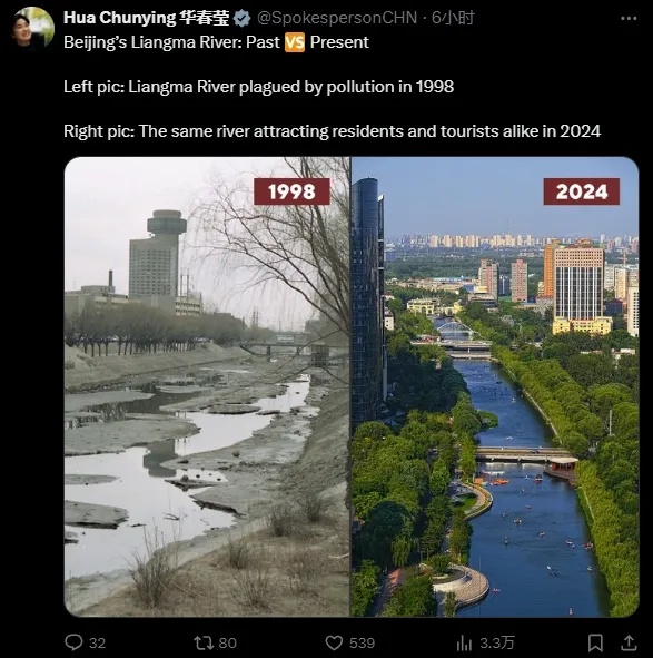 1998年,北京亮马河饱受污染困扰,河水枯竭。2024年,亮马河焕然一新,深受市民和游客欢迎。