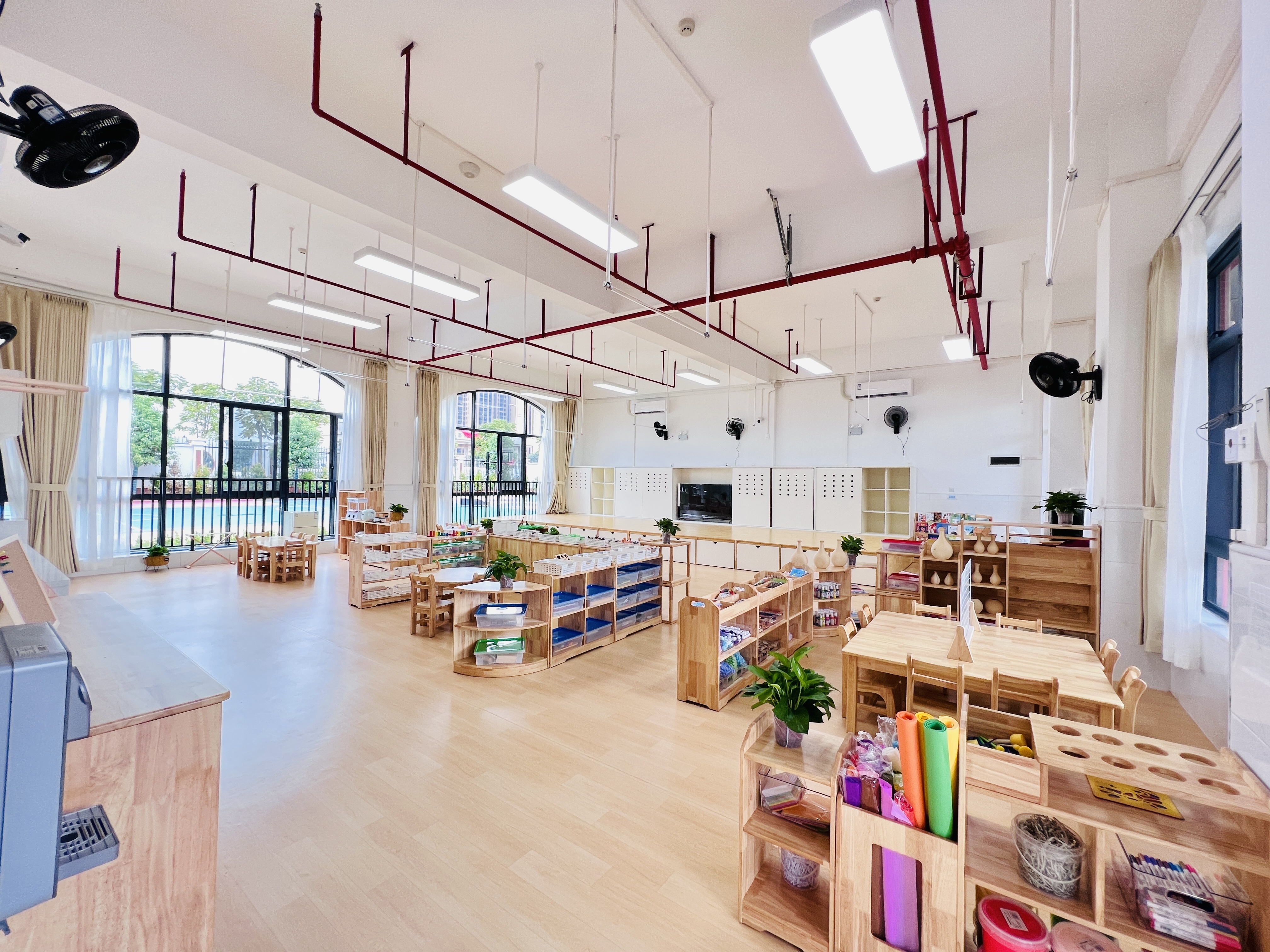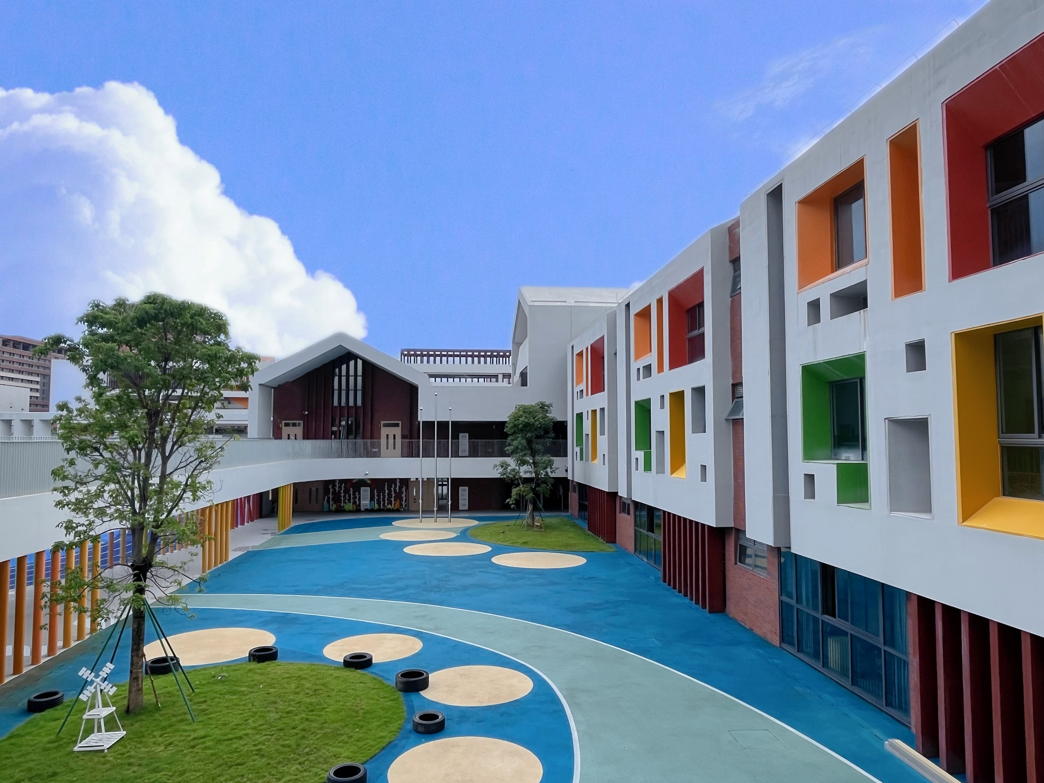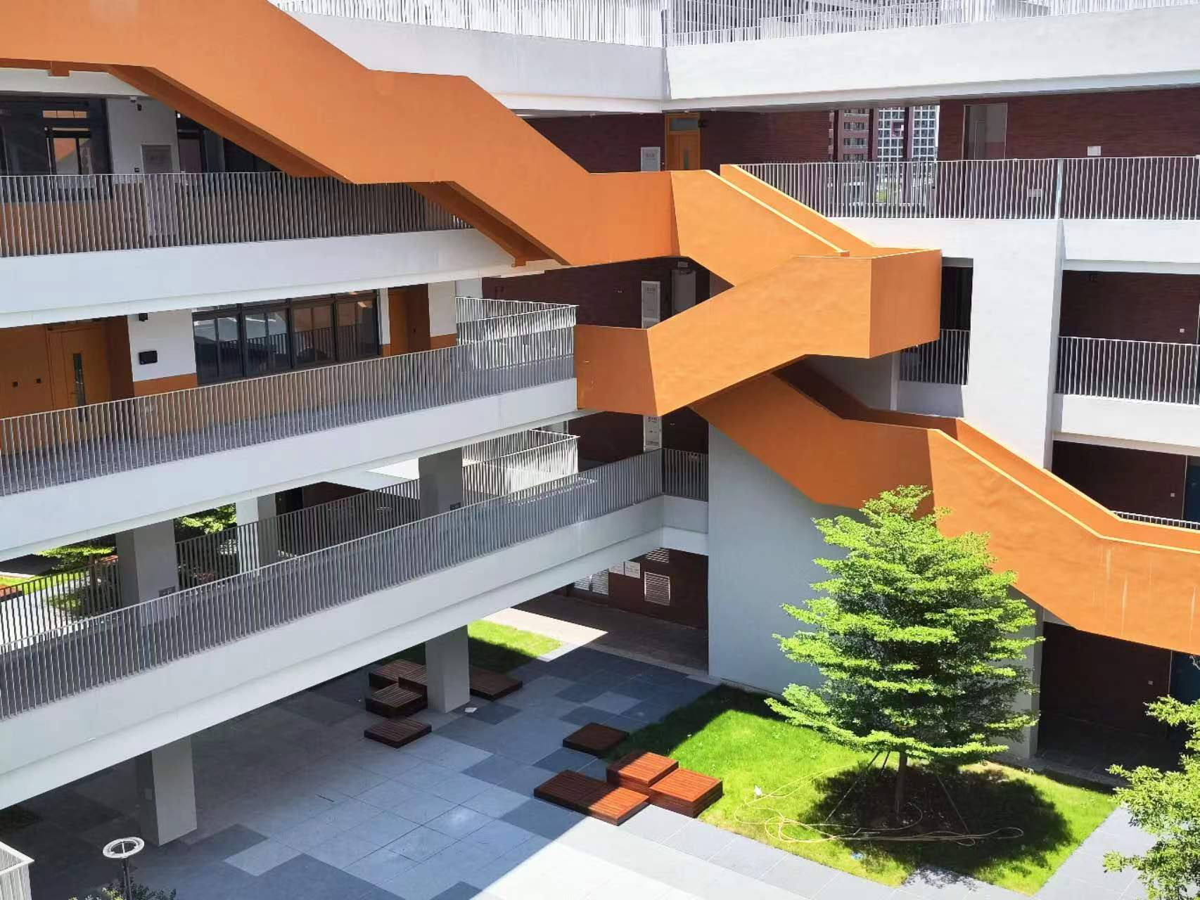 在东校区,教学楼外观以红、黄、蓝三色为主色,颇为现代简约。楼内配备课室和专用课室,建有阶梯室、舞蹈室、音乐室、电脑室、图书室、午休室、心理咨询室等。