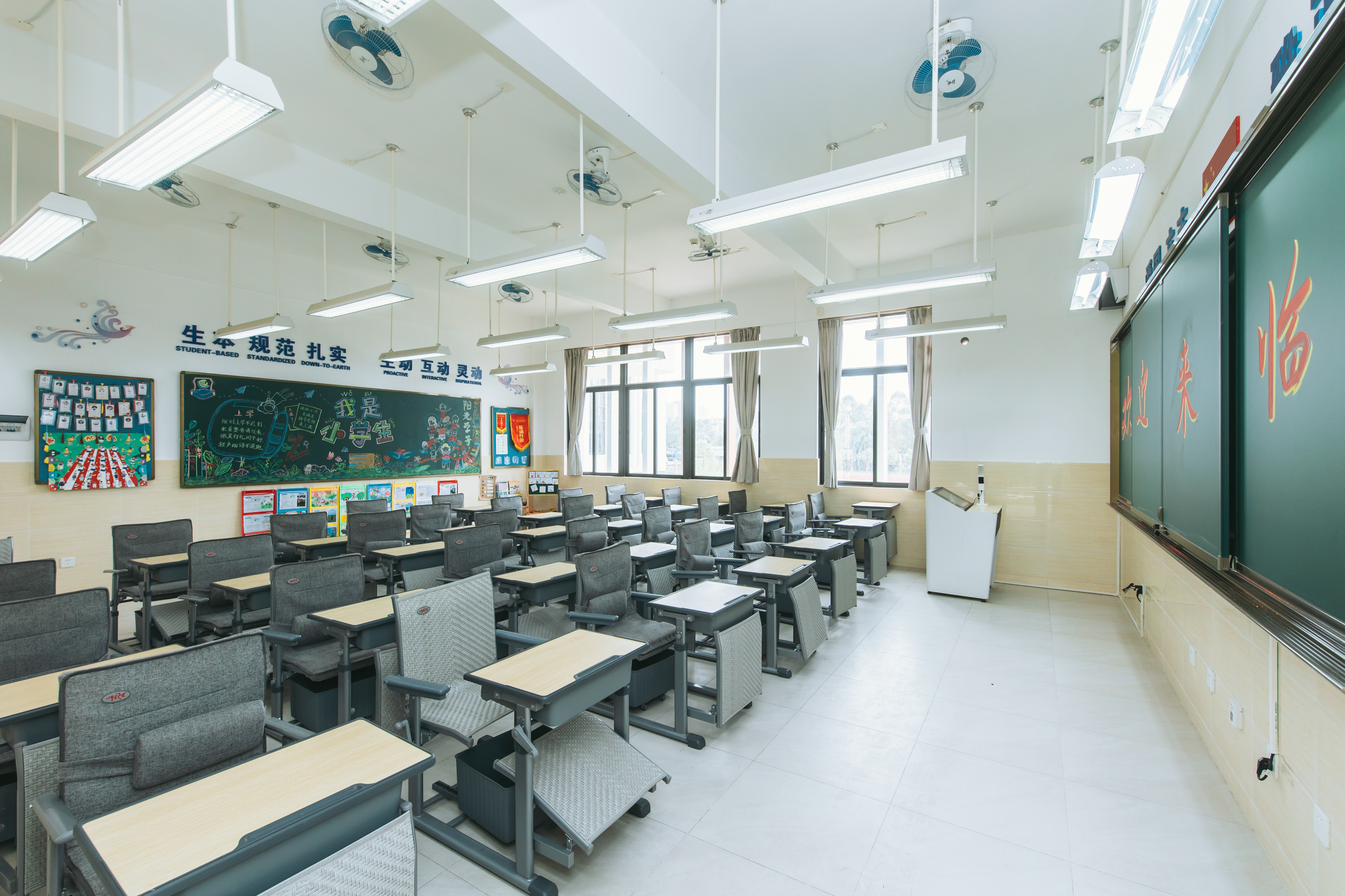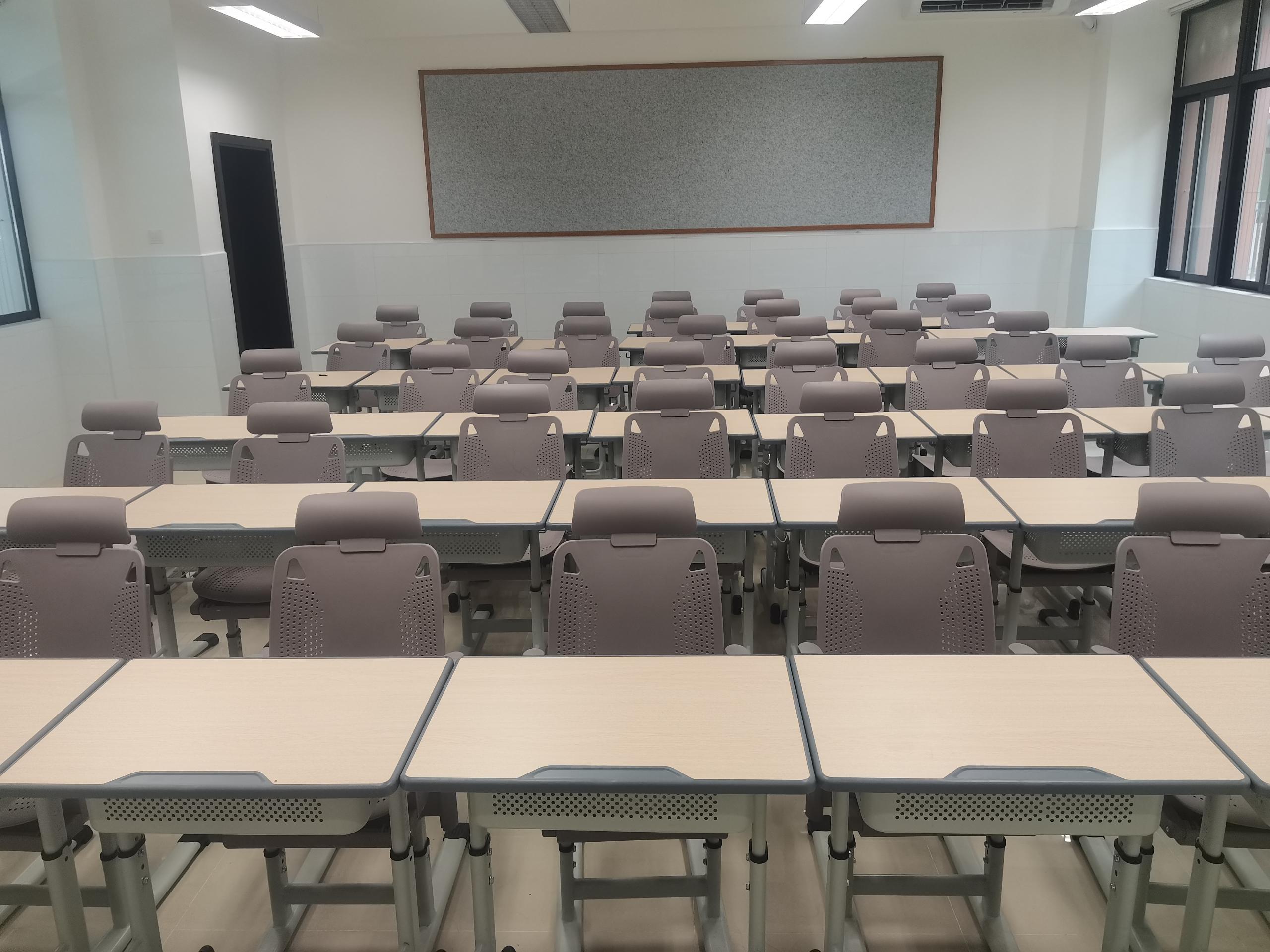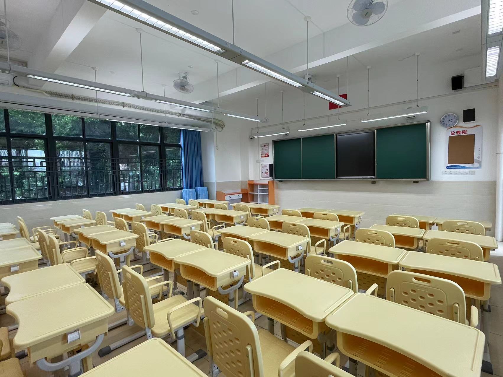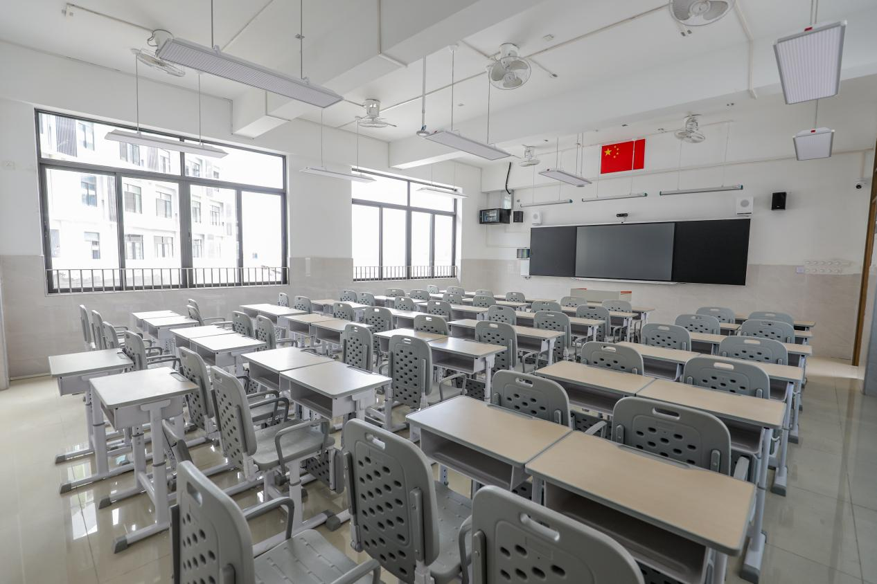 学校占地面积8545平方米,建筑面积6334平方米,配置了课室、可容纳180多人的多功能教室以及科学实验室、音乐室等教学空间。此外,课室内,每张课桌下方都贴心地放置了折叠床,供学生午休使用。