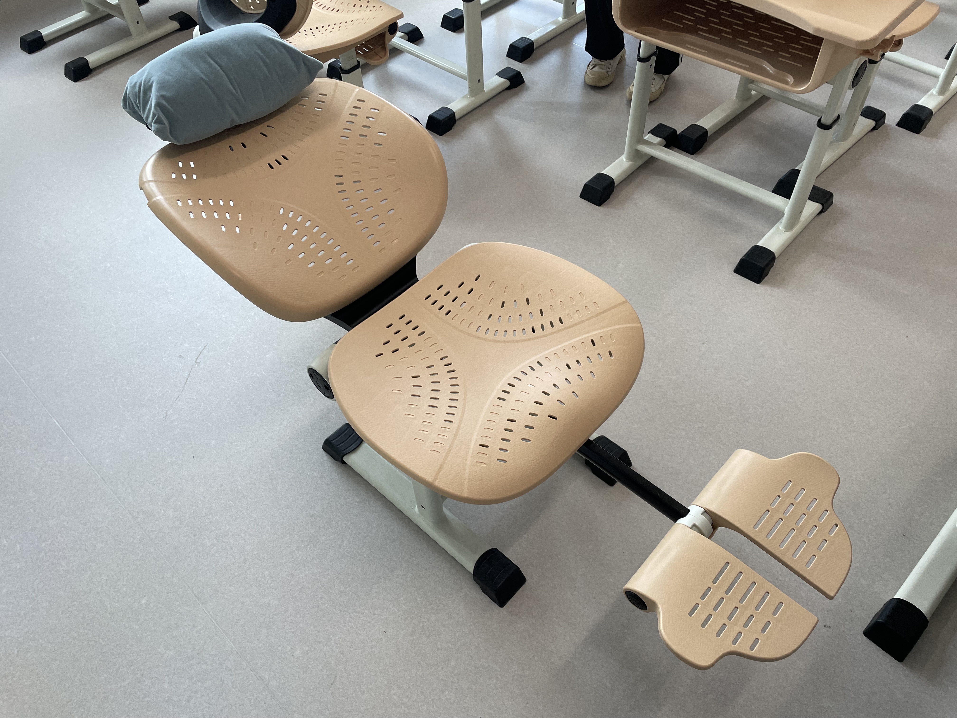 海外二小为学生配备的桌椅稍显特别——偏圆形且有曲面设计的座椅靠背,坐垫高度可调节,带有可收纳、隐藏式的脚托,靠背可以调节角度至最多150度。“打开旋钮、拉开脚托、拿出头枕,学习用的座椅就可以变成午休躺椅,实现学生原地100%‘平躺睡’。”学校校长陈愉说。