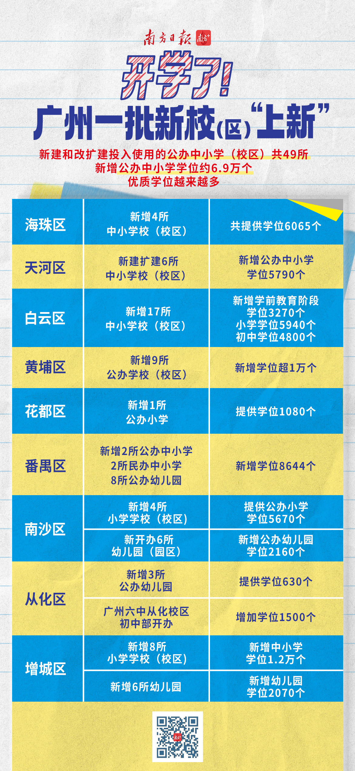 今年秋季,广州一批新学校(校区)接连“上新”。其中,新建和改扩建投入使用的公办中小学(校区)共49所,新增公办中小学学位约6.9万个,优质学位越来越多。