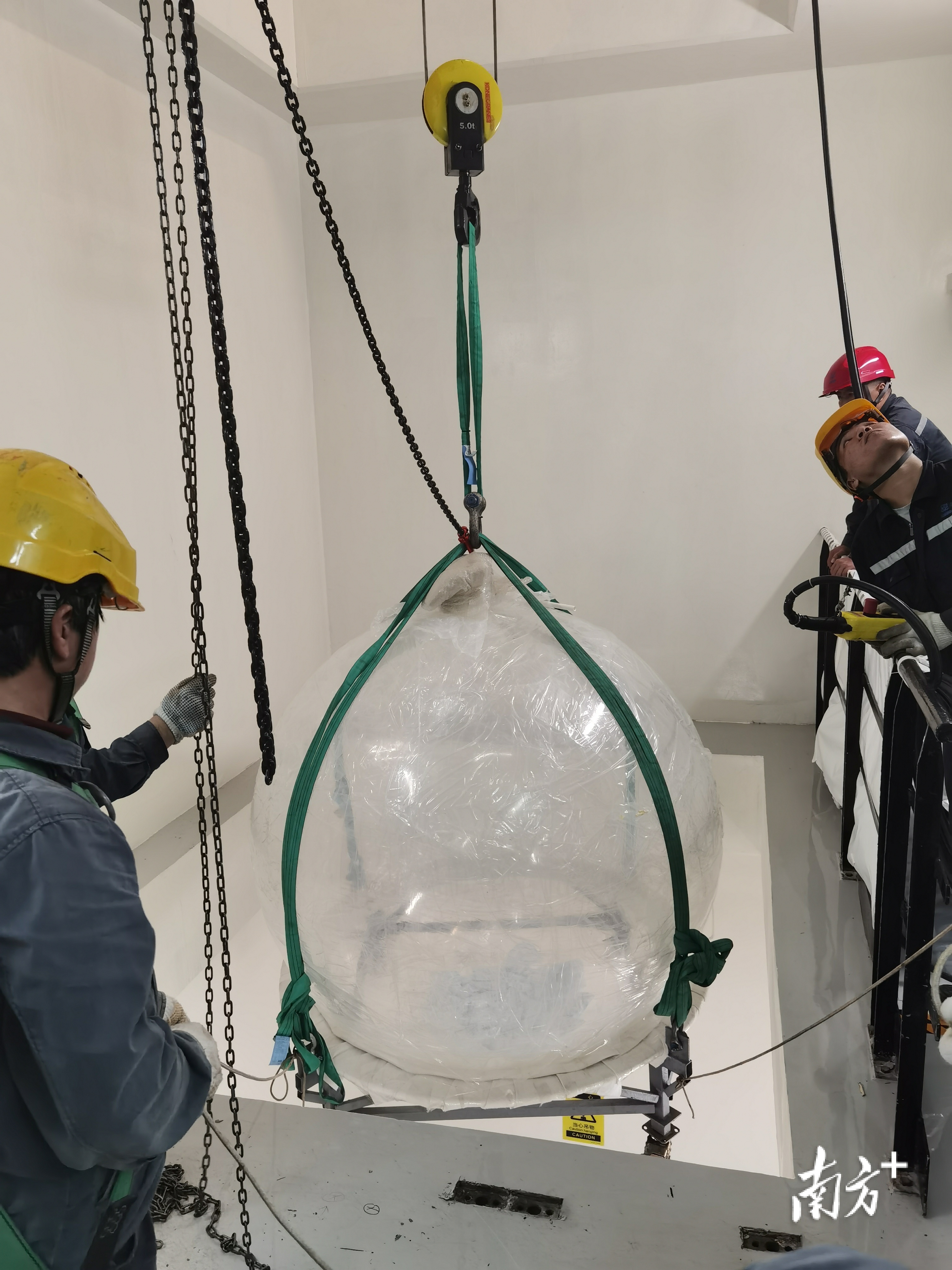 正在引入有机玻璃球,将用于盛装捕捉中微子用的神秘液体“液闪”。