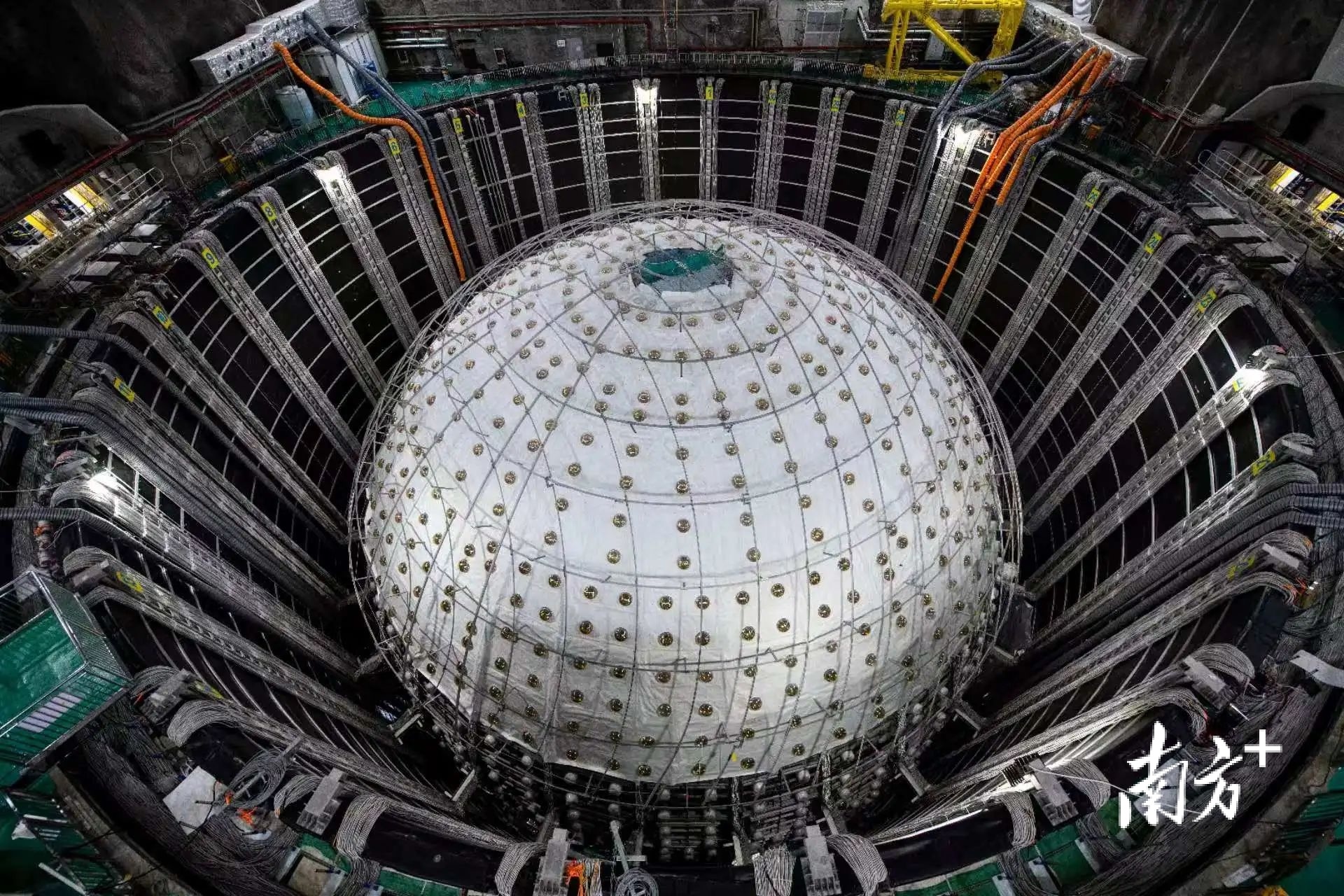 11月20日,南方+记者从中国科学院高能物理研究所了解到,江门中微子实验探测器主体已于今日建成。这一标志性成就预示着该项目即将进入下一阶段——超纯水与液体闪烁体的灌装,并预计于2025年8月正式运行取数。