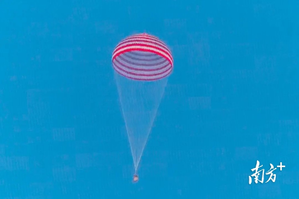 神舟十六号载人飞船返回舱顺利穿越“黑障区”,在距离地面40公里的上空,飞船打开了降落伞。红白相间的巨大降落伞在晨光的照耀下鲜艳夺目,指挥中心响起了热烈的掌声。